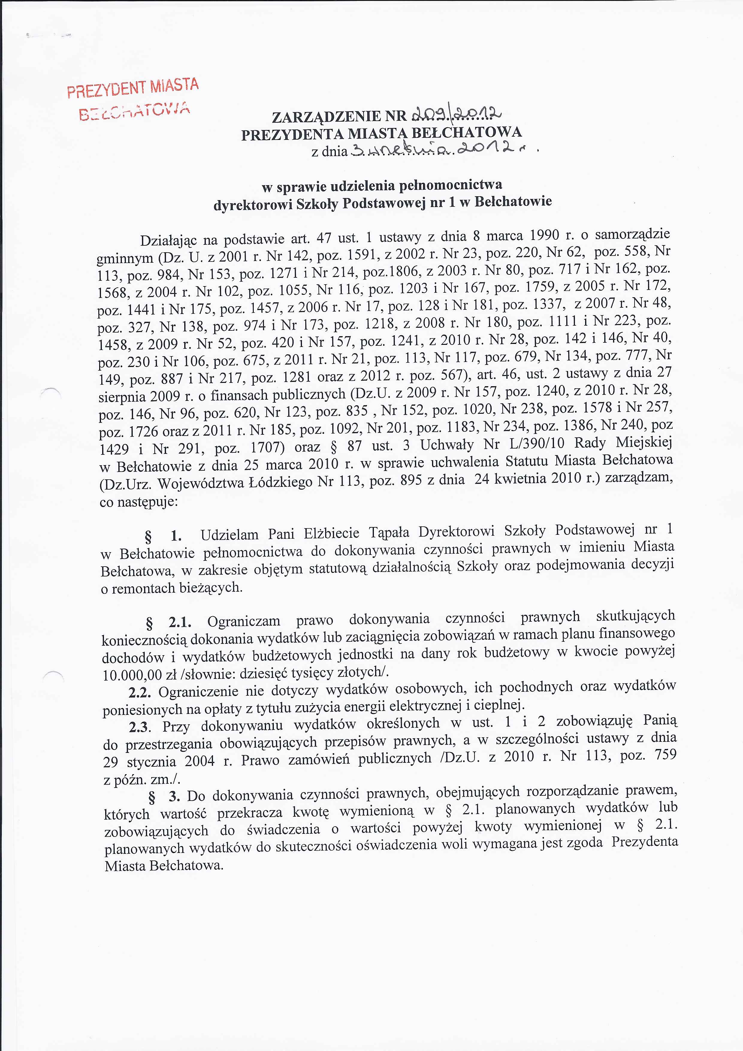 Zarządzenie Nr 209 z dnia 3 września 2012 r. w/s udzielenia pełnomocnictwa dyrektorowi Szkoły Podstawowej nr 1 w Bełchatowie
