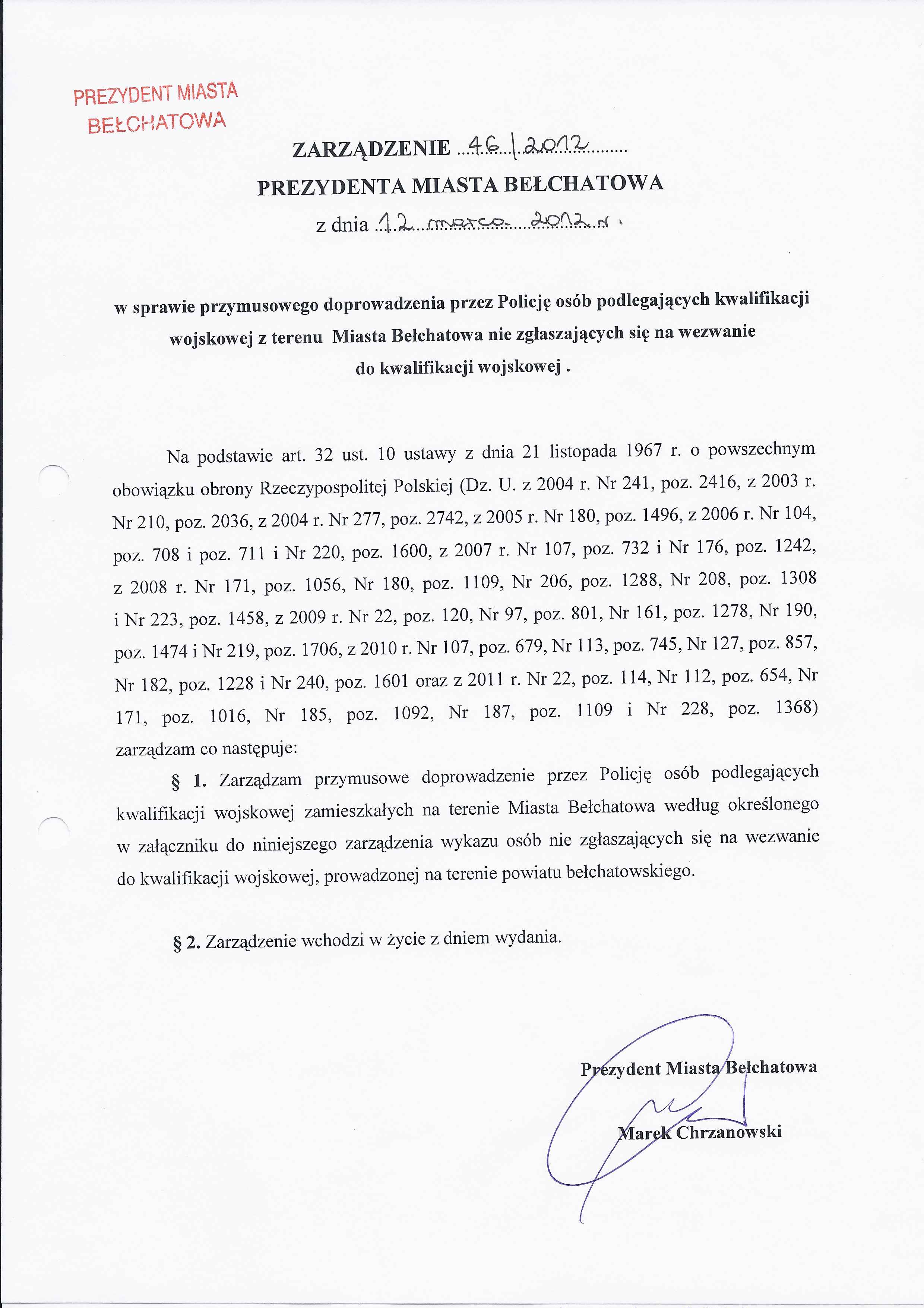 Zarządzenie Nr 46 z dnia 12 marca 2012 r. w/s przymusowego doprowadzenia przez Policję osób podlegających kwalifikacji wojskowej z terenu Miasta Bełchatowa nie zgłaszających się na wezwanie do kwalifikacji wojskowej