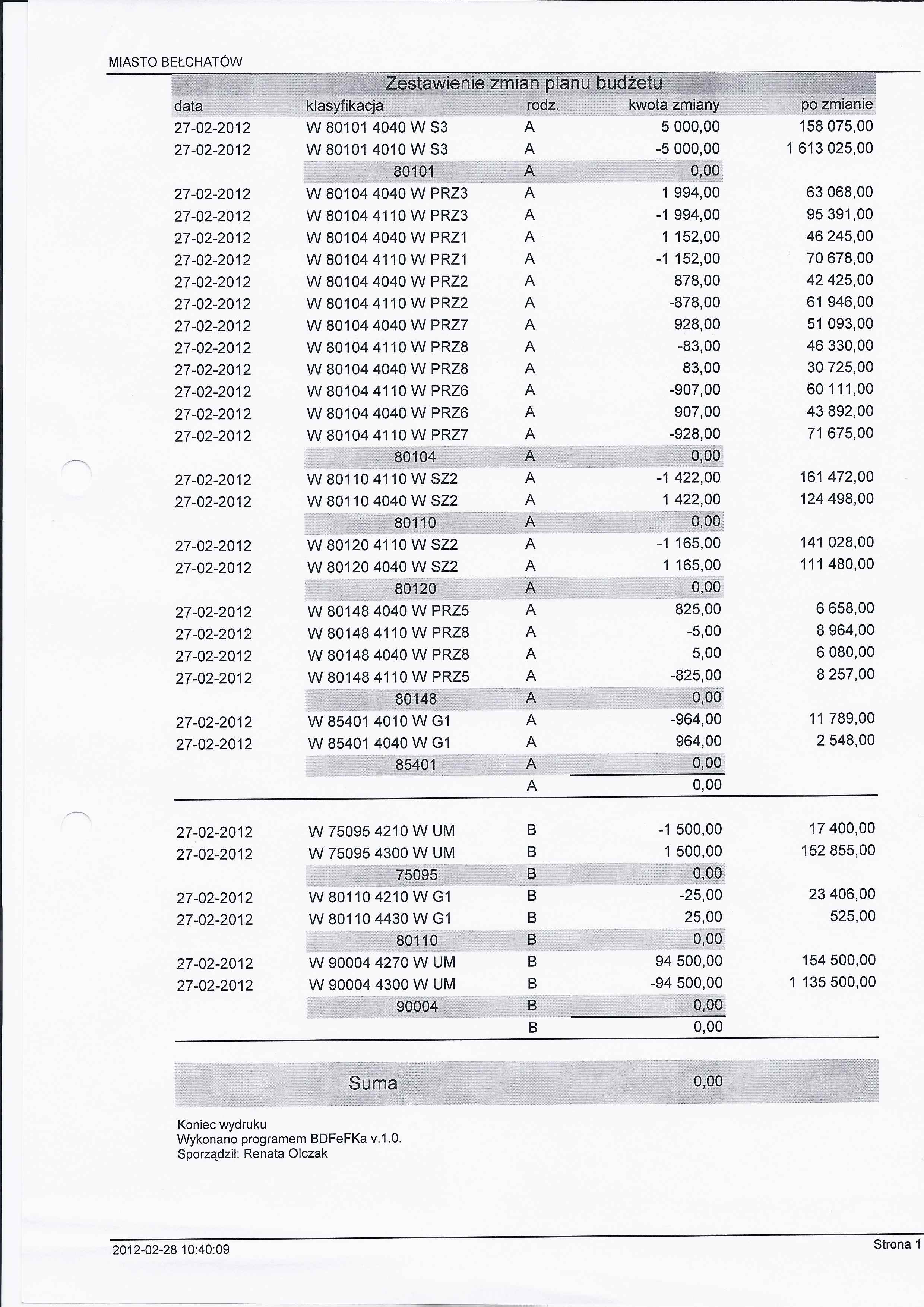 Zarządzenie Nr 42 z dnia 27 lutego 2012 r. w/s zmian w budżecie Miasta Bełchatowa na 2012 rok