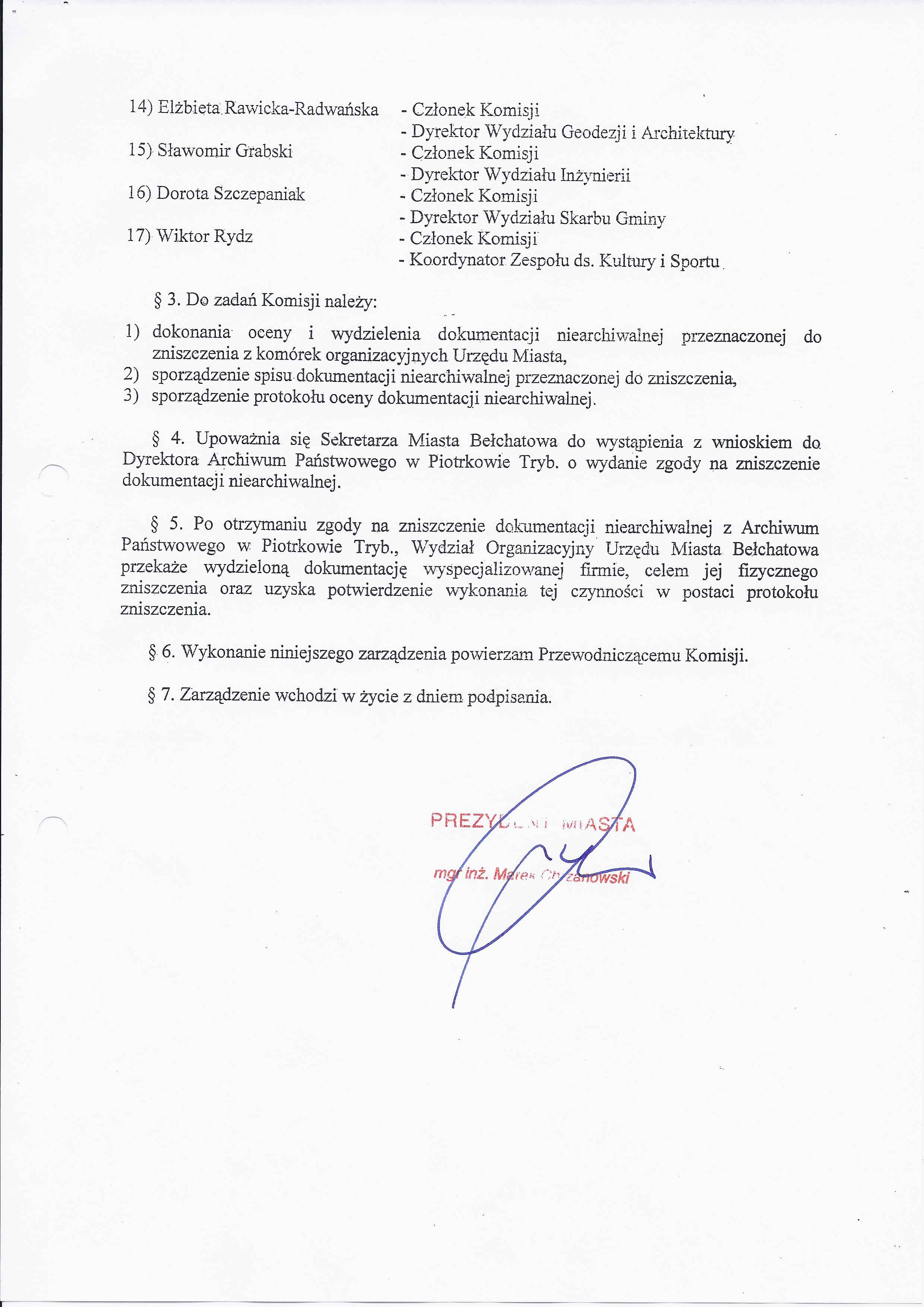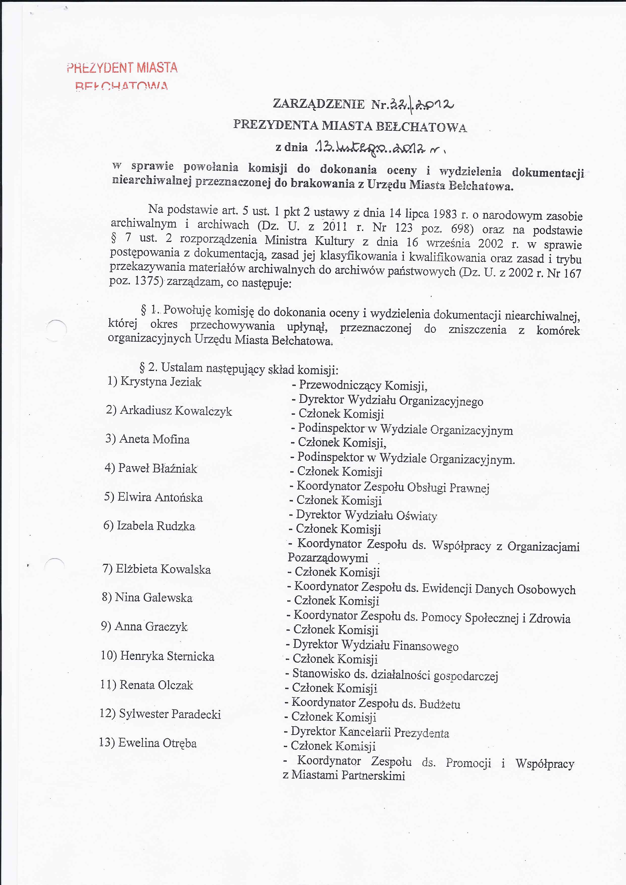 Zarządzenie Nr 32 z dnia 13 lutego 2012 r. w/s powołania komisji do dokonania oceny i wydzielenia dokumentacji niearchiwalnej przeznaczonej do brakowania z Urzędu Miasta Bełchatowa