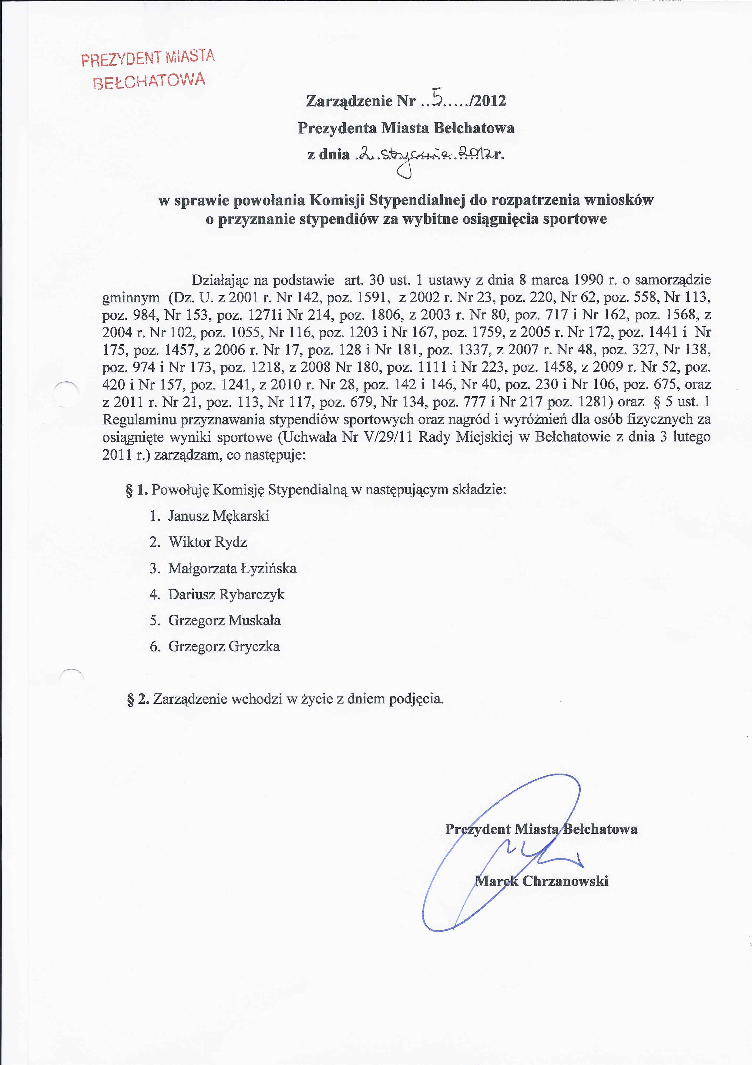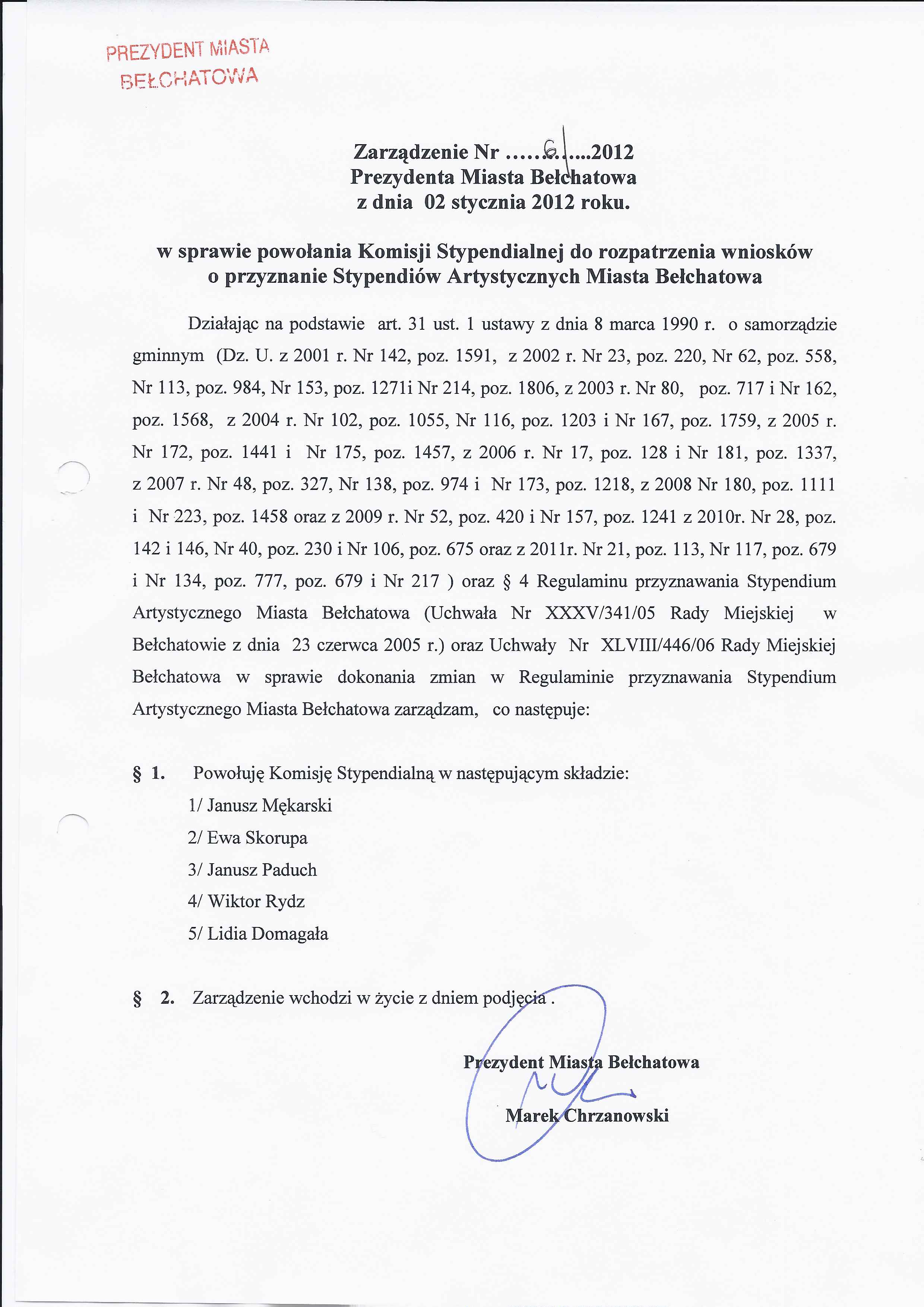 Zarządzenie Nr 6 z dnia 2 stycznia 2012 r. w/s powołania Komisji Stypendialnej do rozpatrzenia wniosków o przyznanie Stypendiów Artystycznych Miasta Bełchatowa