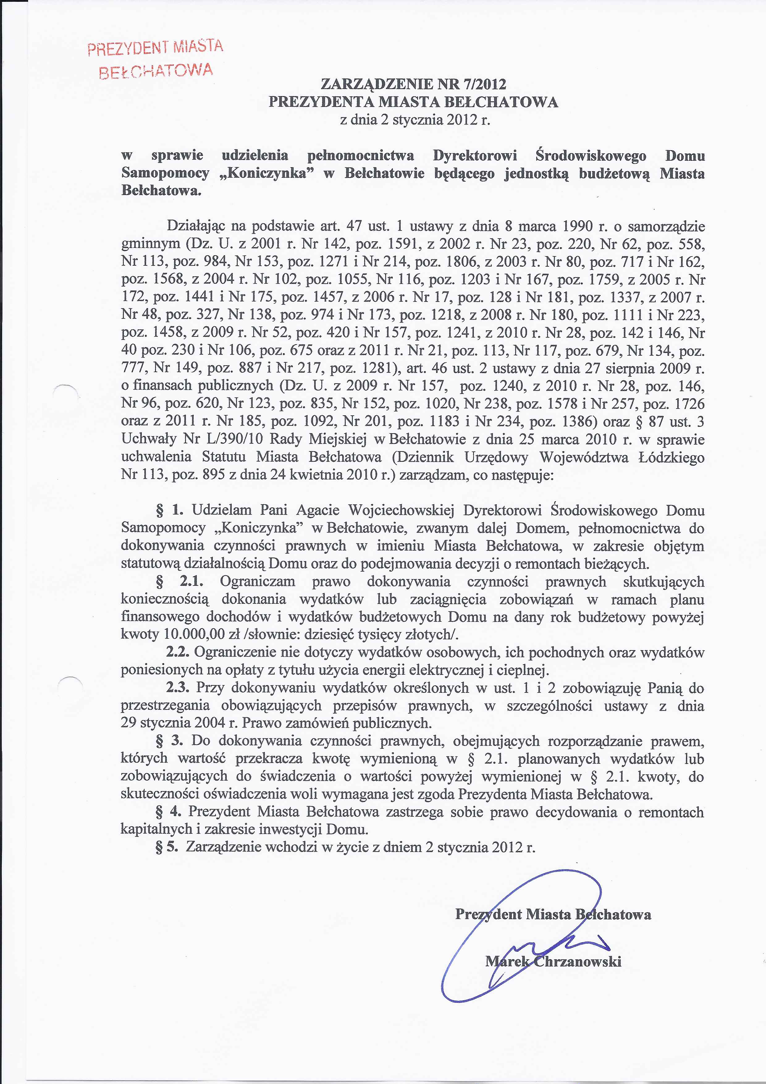 Zarządzenie Nr 7 z dnia 2 stycznia 2012 r. w/s udzielenia pełnomocnictwa Dyrektorowi Środowiskowego Domu Samopomocy "Koniczynka" w Bełchatowie będącą jednostką budżetową Miasta Bełchatowa
