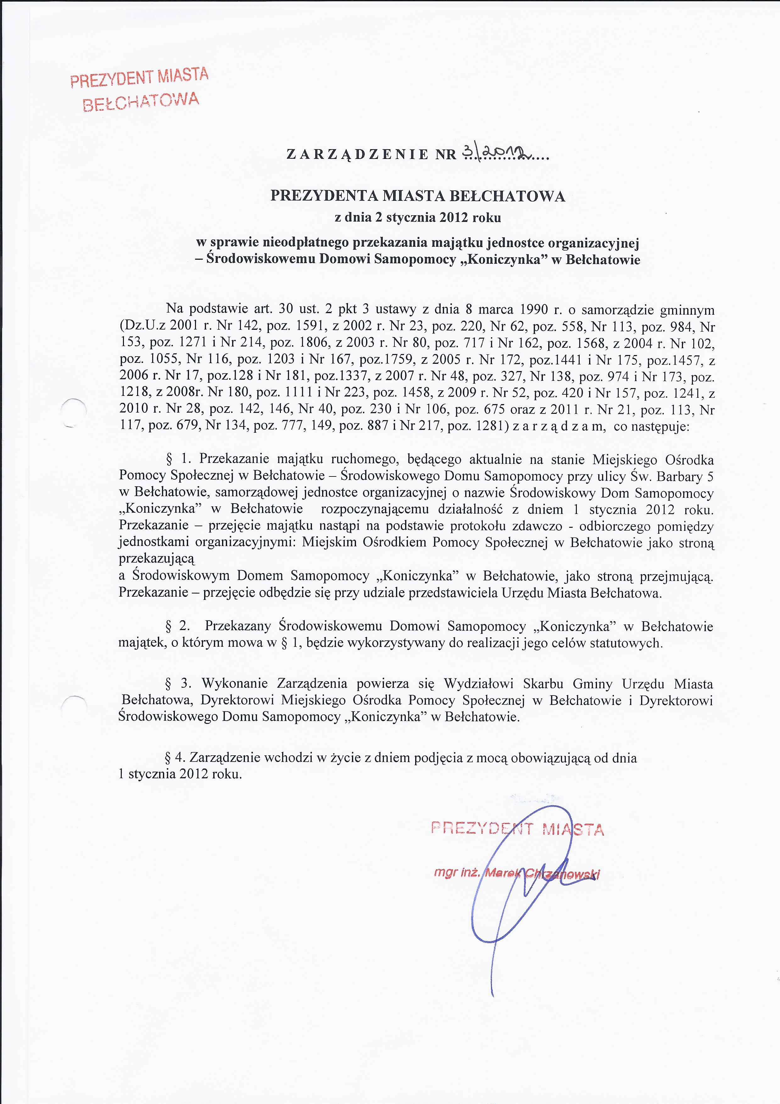 Zarządzenie Nr 3 z dnia 2 stycznia 2012 r. w/s nieodpłatnego przekazania majątku jednostce organizacyjnej - Środowiskowemu Domowi Samopomocy "Koniczynka" w Bełchatowie