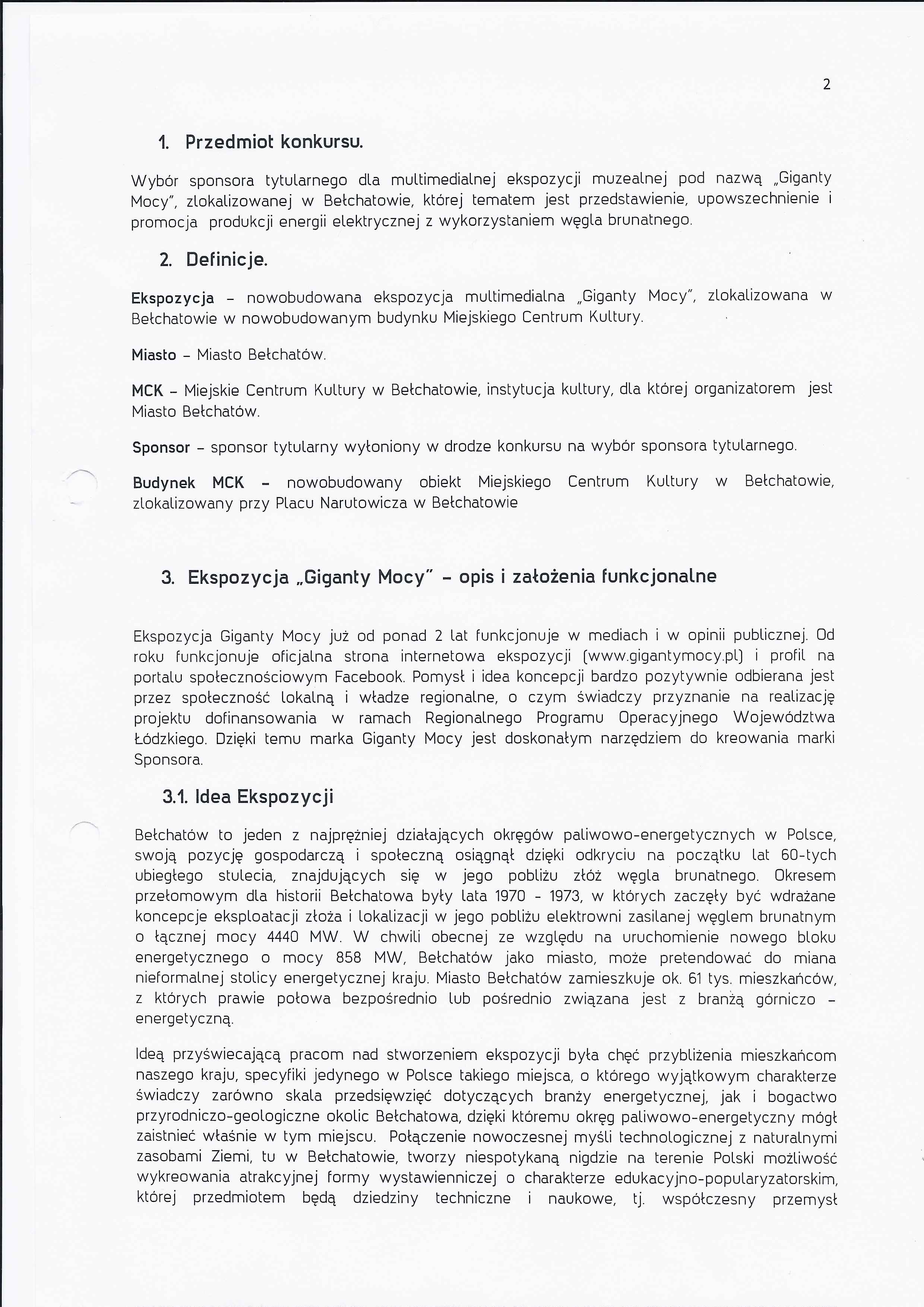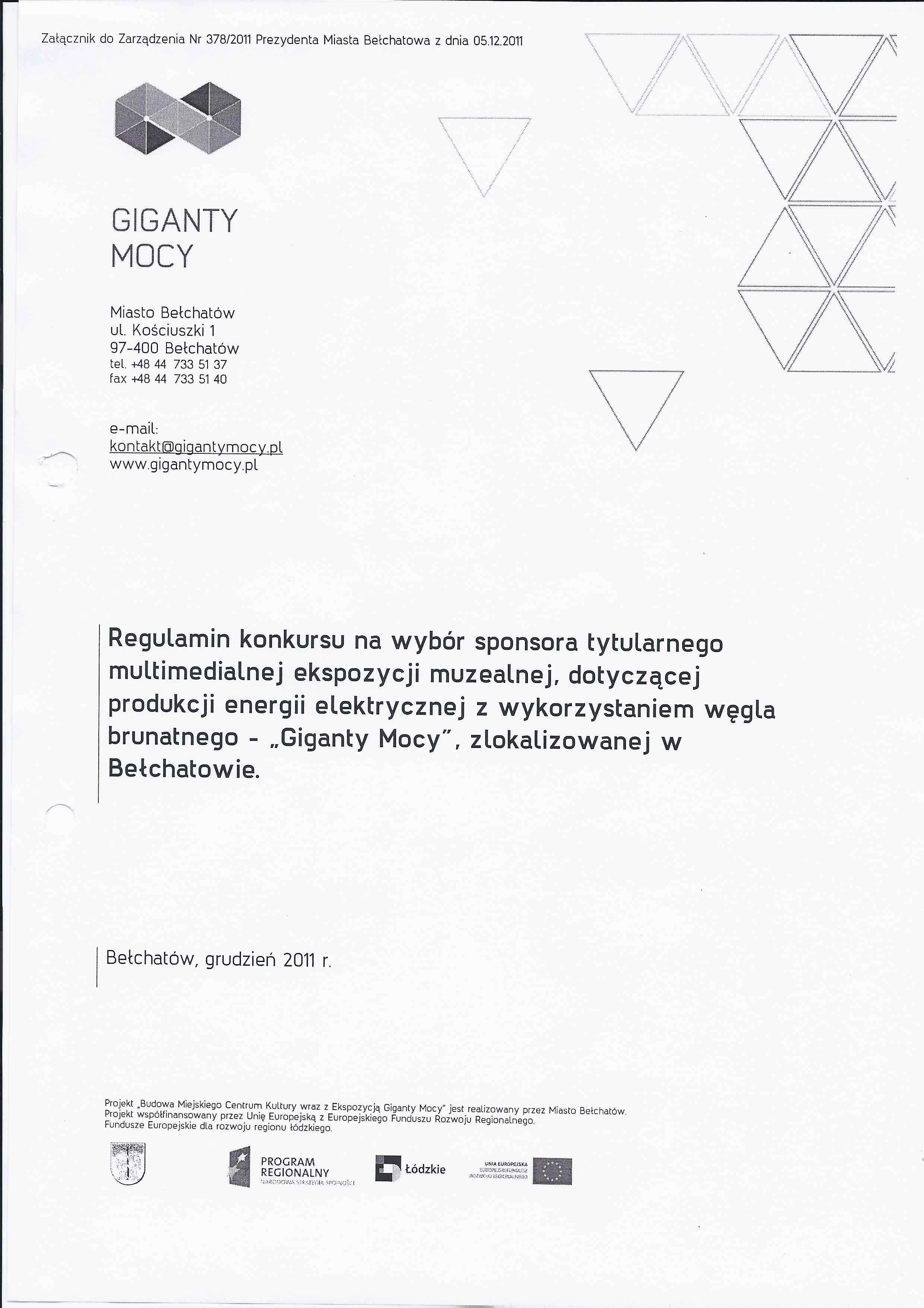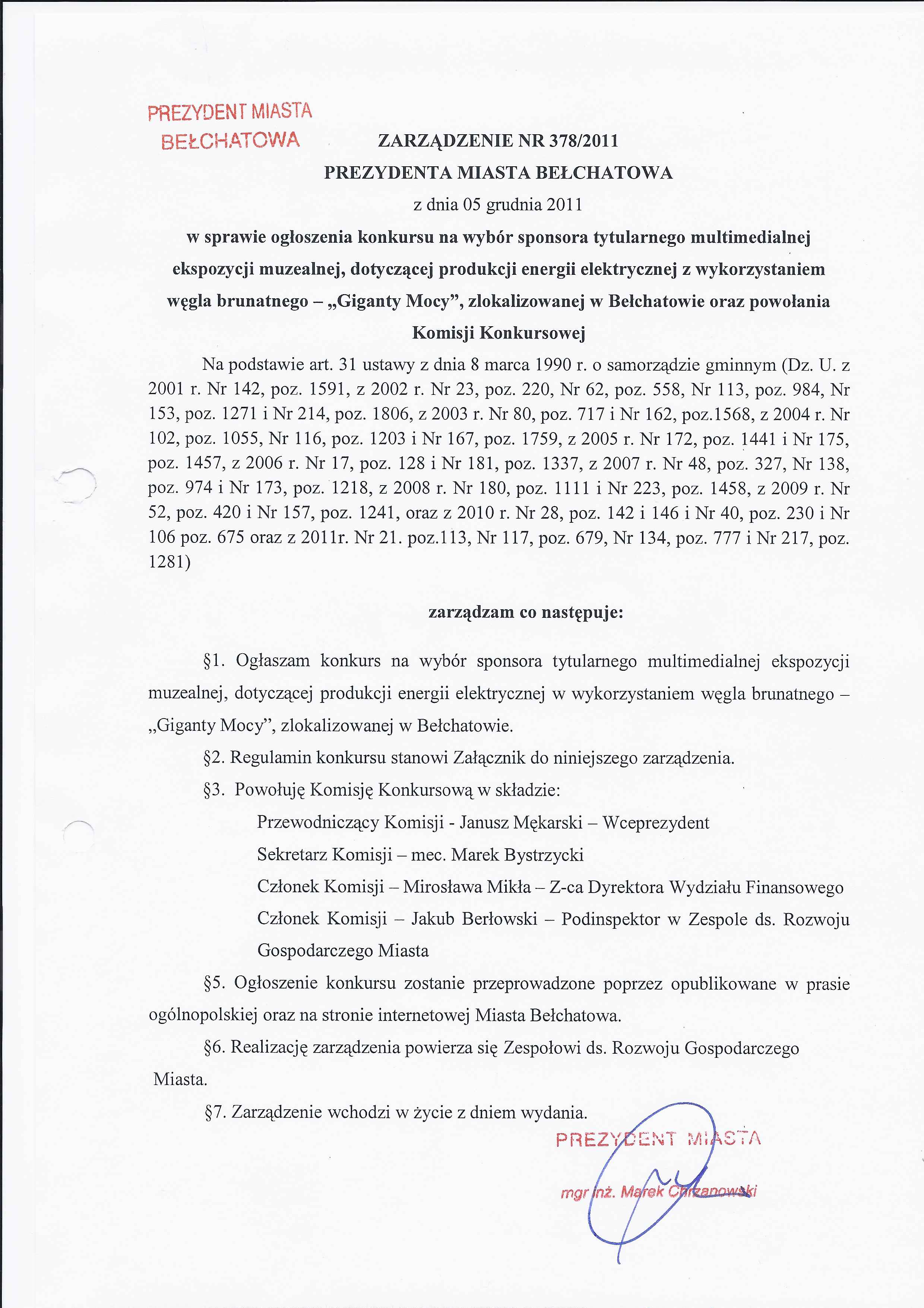 Zarządzenie Nr 378 z dnia 5 grudnia 2011 r. w/s ogłoszenia konkursu na wybór sponsora tytulytarnego multimedialnej ekspozycji muzealnej, dotyczącej produkcji energii elektrycznej z wykorzystaniem węgla brunatnego - "Giganty Mocy", zlokalizowanej w Bełchatowie oraz powołania Komisji Konkursowej