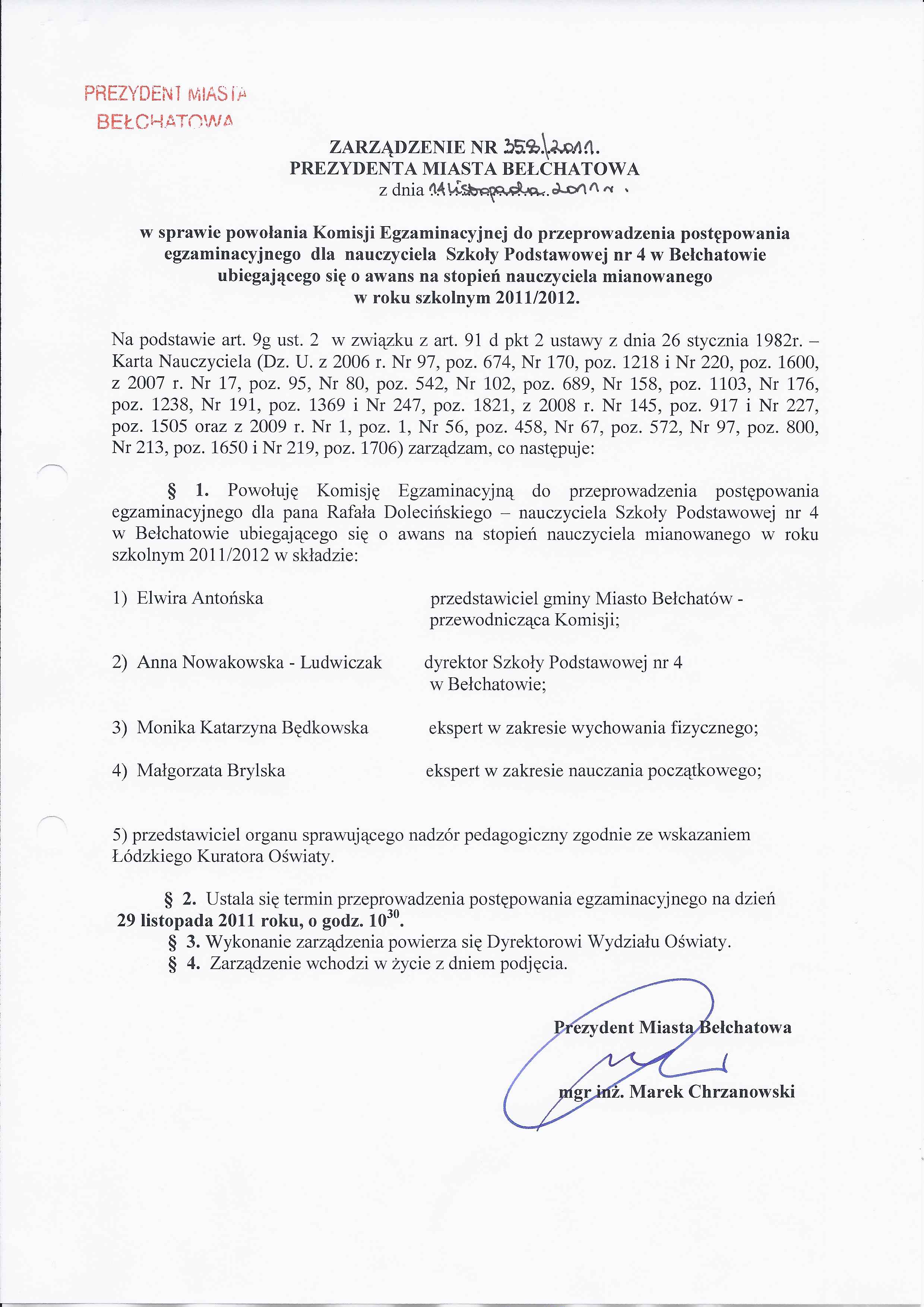 Zarządzenie Nr 358 z dnia 14 listopada 2011 r. w/s powołania Komisji Egzaminacyjnej do przeprowadzenia postępowania egzaminacyjnej dla nauczyciela Szkoły Podstawowej nr 4 w Bełchatowie ubiegającego się o awans na stopień nauczyciela mianowanego w roku szkolnym 2011/2012
