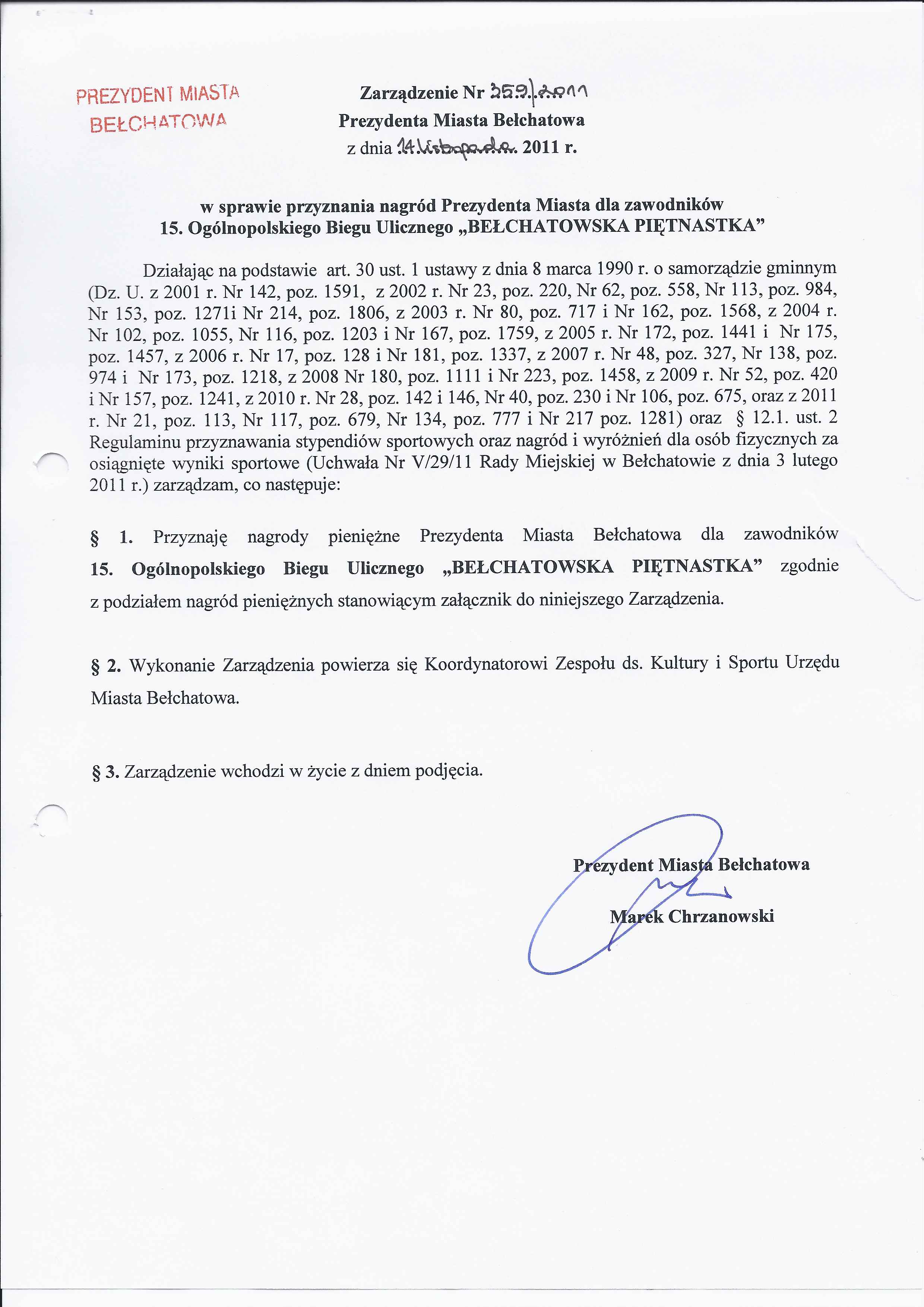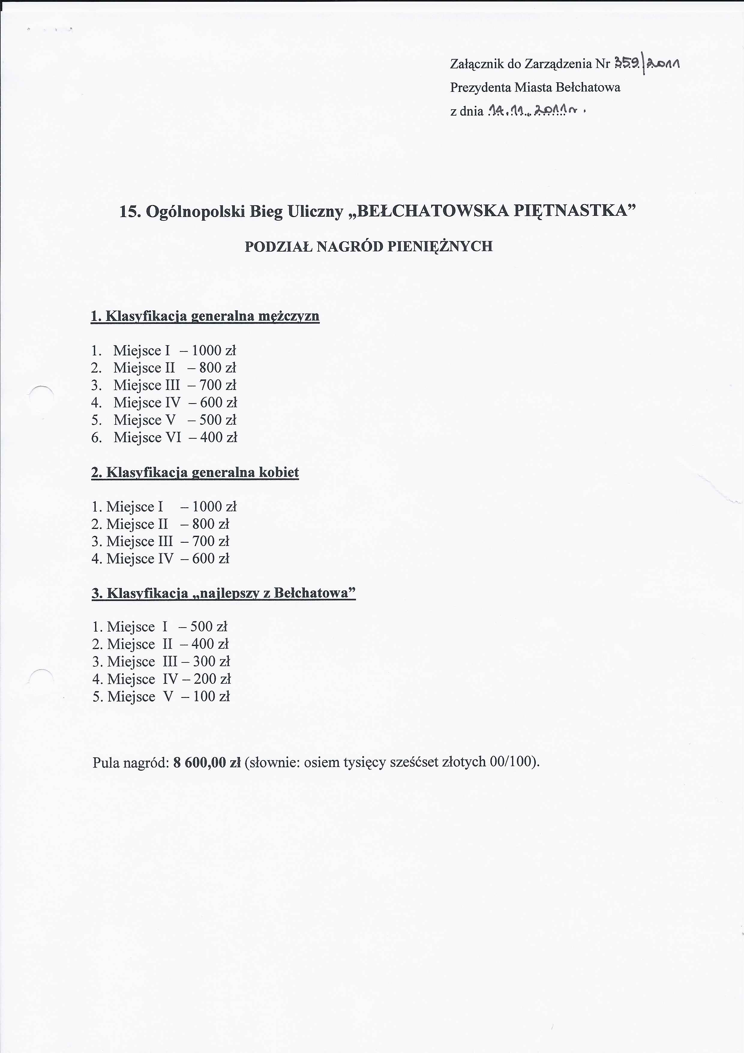 Zarządzenie Nr 359 z dnia 14 listopada 2011 r. w/s przyznania nagród Prezydenta Miasta dla zawodników 15. Ogólnopolskiego Biegu Ulicznego "BEŁCHATOWSKA PIĘTNASTKA"