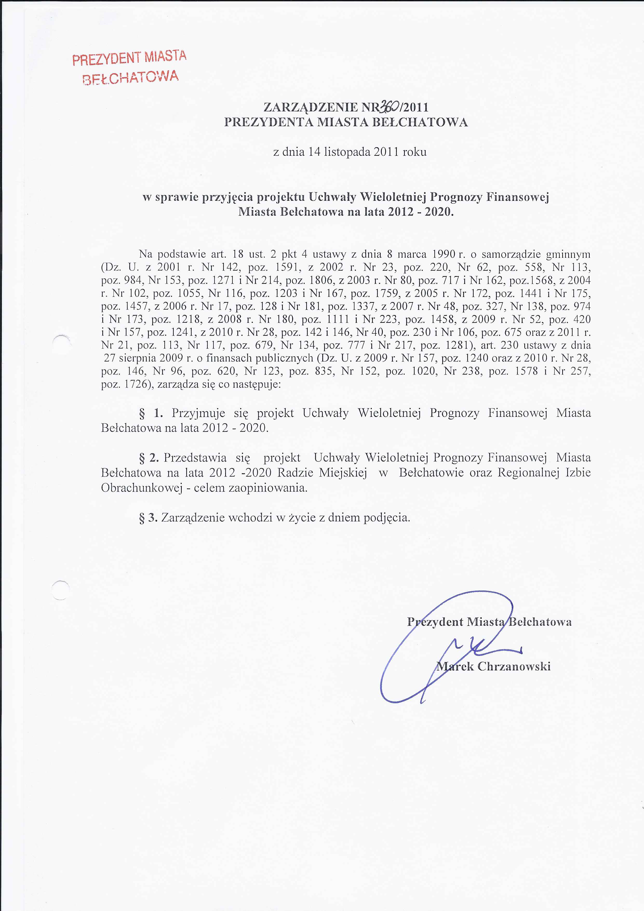 Zarządzenie Nr 360 z dnia 14 listopada 2011 r. w/s przyjęcia projektu Uchwały Wieloletniej Prognozy Finansowej Miasta Bełchatowa na lata 2012-2020