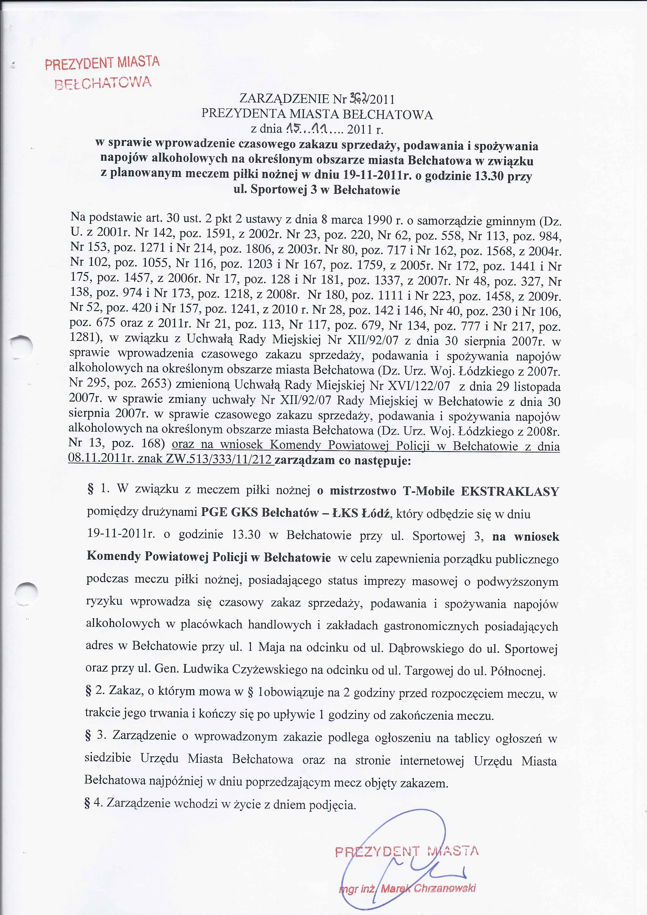 Zarządzenei Nr 362 z dnia 15 listopada 2011 r. w/s wprowadzenia czasowego zakazu sprzedaży, podawania i spożywania napojów alkoholowych na określonym obszarze miasta Bełchatowa w związku z planowanym meczem piłki nożnej w dniu 19-11-2011 r. o godzinie 13.30 przy ul. Sportowej 3 w Bełchatowie