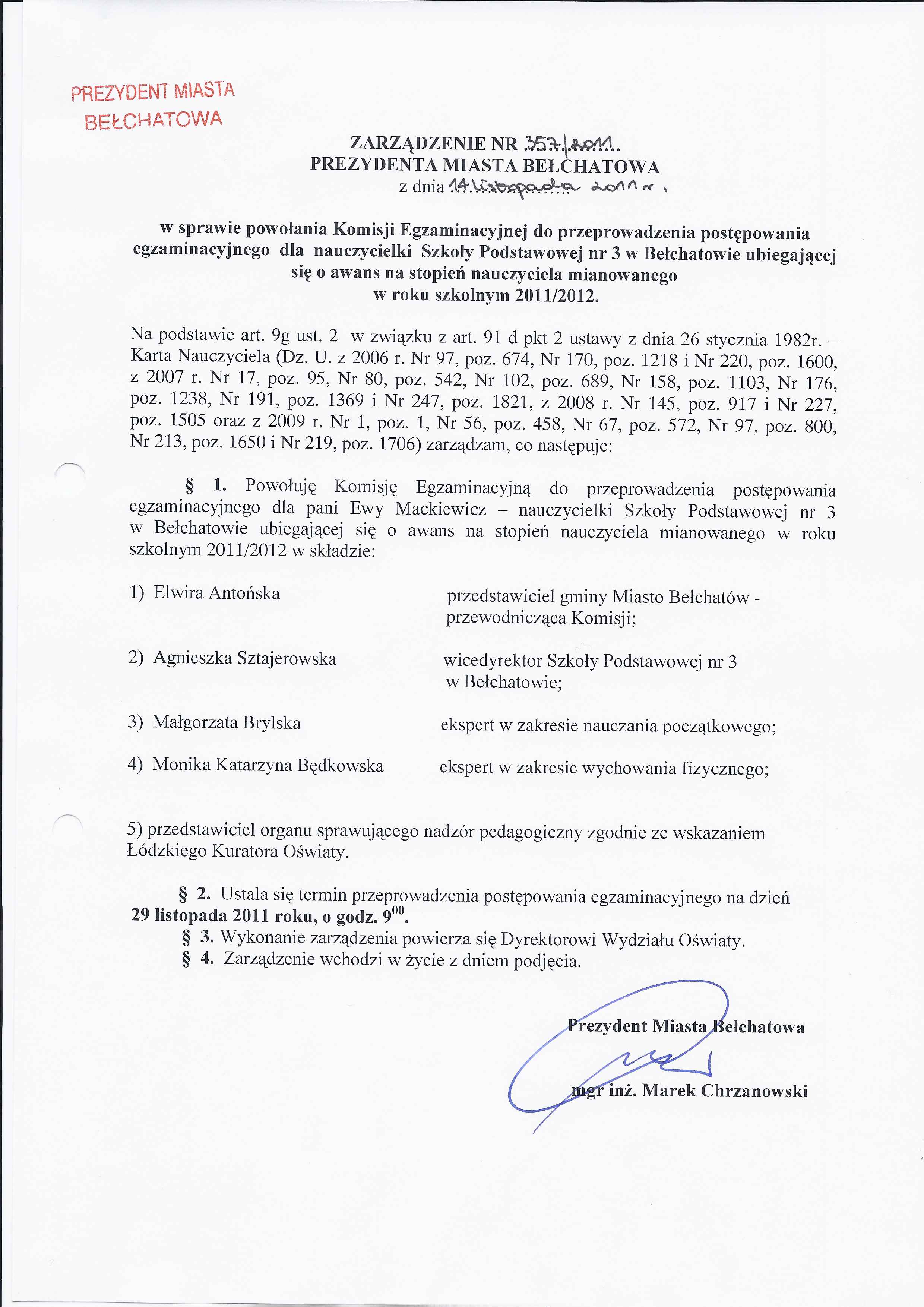 Zarządzenie Nr 357 z dnia 14 listopada 2011 r. w/s powołania Komisji Egzaminacyjnej do przeprowadzenia egzaminacyjnej dla nauczycielki Szkoły Podstawowej nr 3 w Bełchatowie ubiegającej się o awans na stopień nauczyciela mianowanego w roku szkolnym 2011/2012