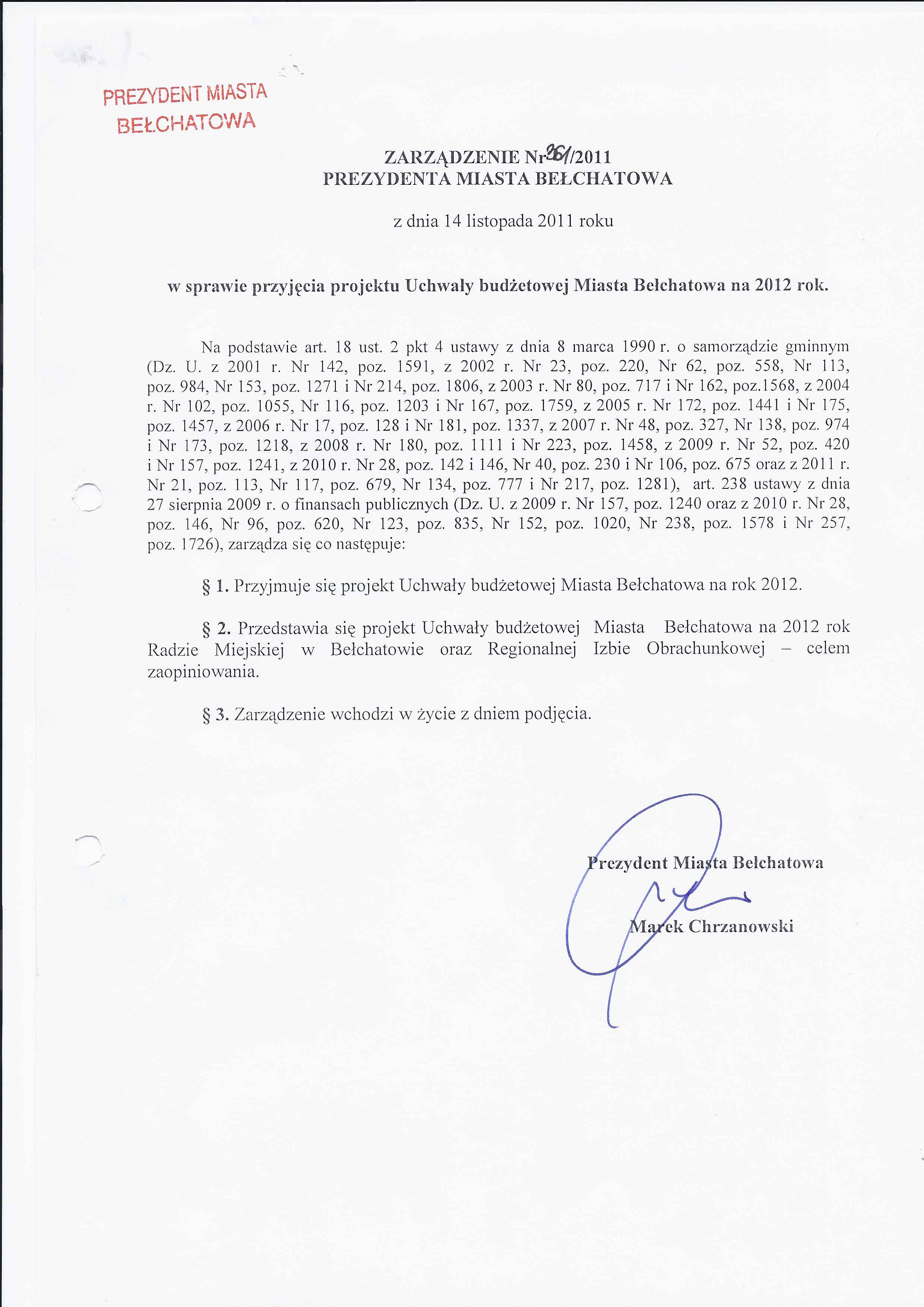 Zarządzenie Nr 361 z dnia 14 listopada 2011 r. w/s przyjęcia projektu Uchwały budżetowej Miasta Bełchatowa na 2012 rok