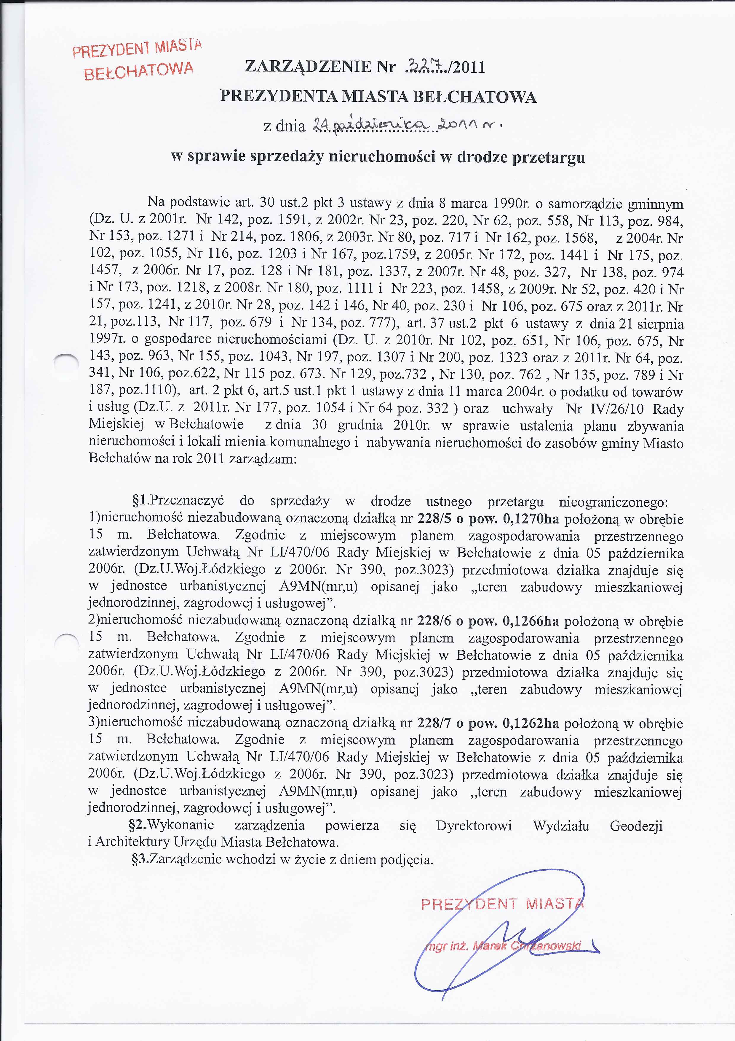 Zarządzenie Nr 328 z dnia 24 października 2011 r. w/s nieodpłatnego nabycia na majątek Miasta Bełchatowa przyłącza wodociągowego i urządzenia kanalizacji sanitarnej do posesji przy ul. S. Batorego 23 - działka nr 596 obr. 09 m. Bełchatowa