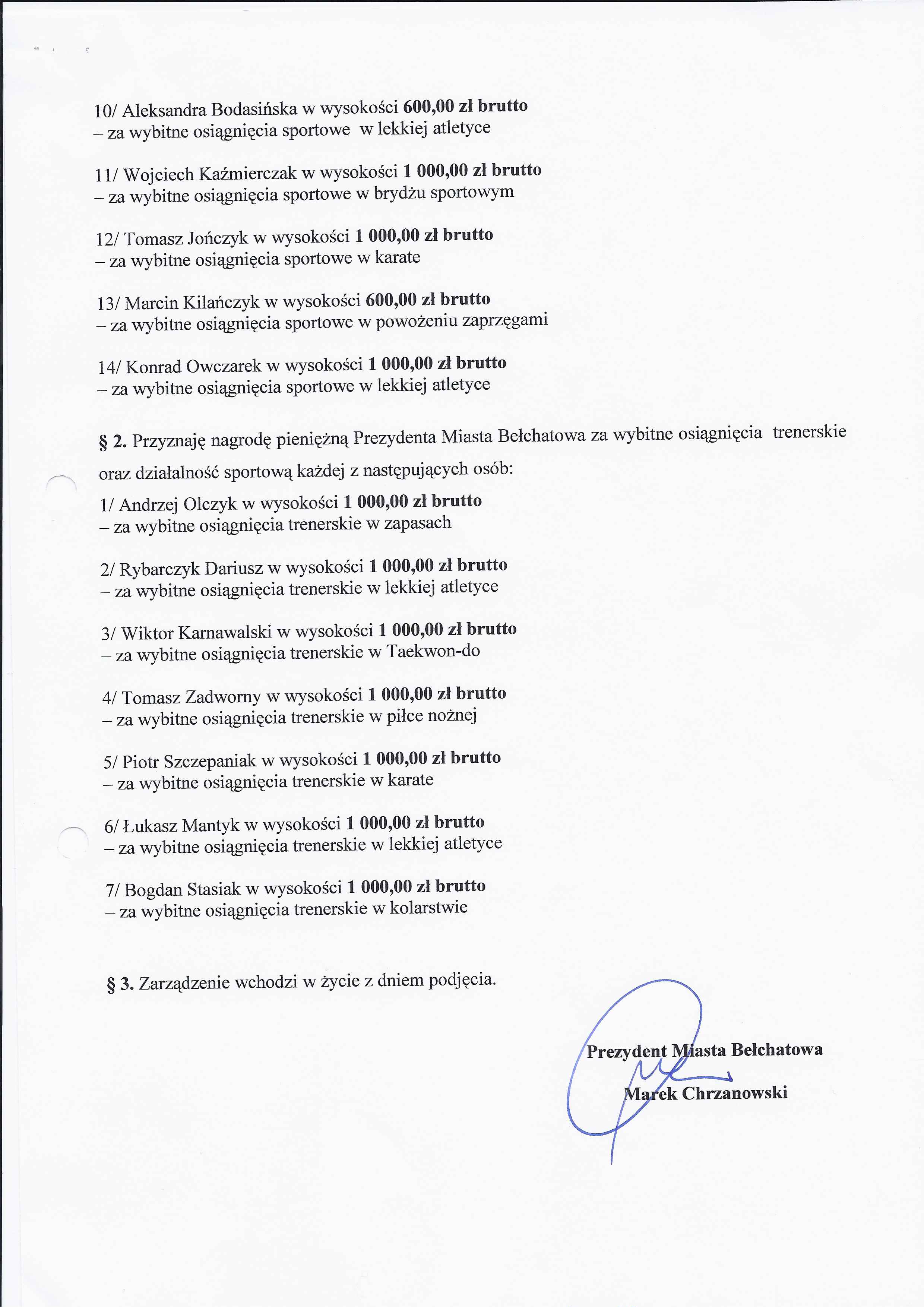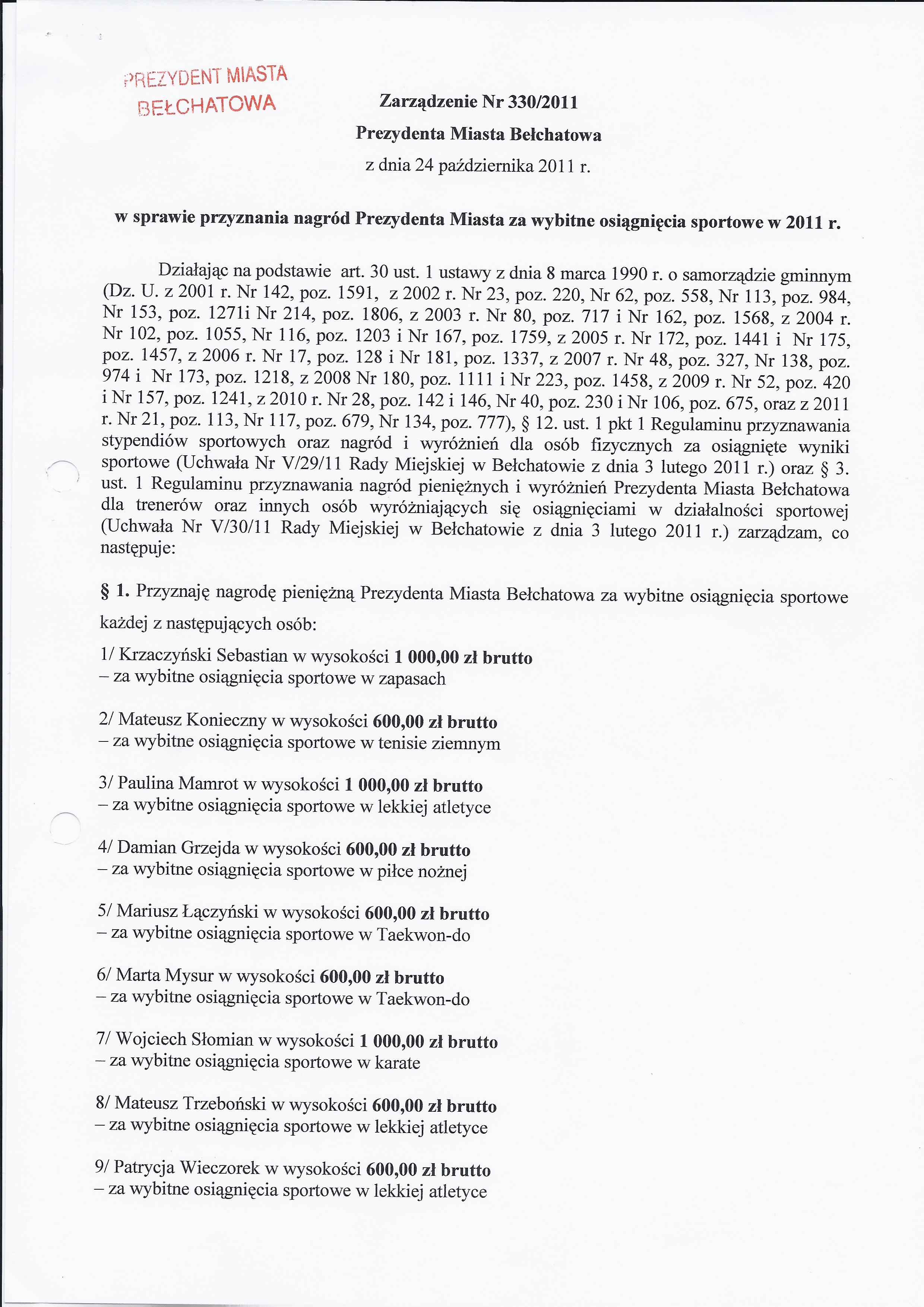 Zarządzenie Nr 330 z dnia 24 października 2011 r. w/s przyznania nargód Prezydenta Miasta za wybitne osiągnięcia sportowe w 2011 r.