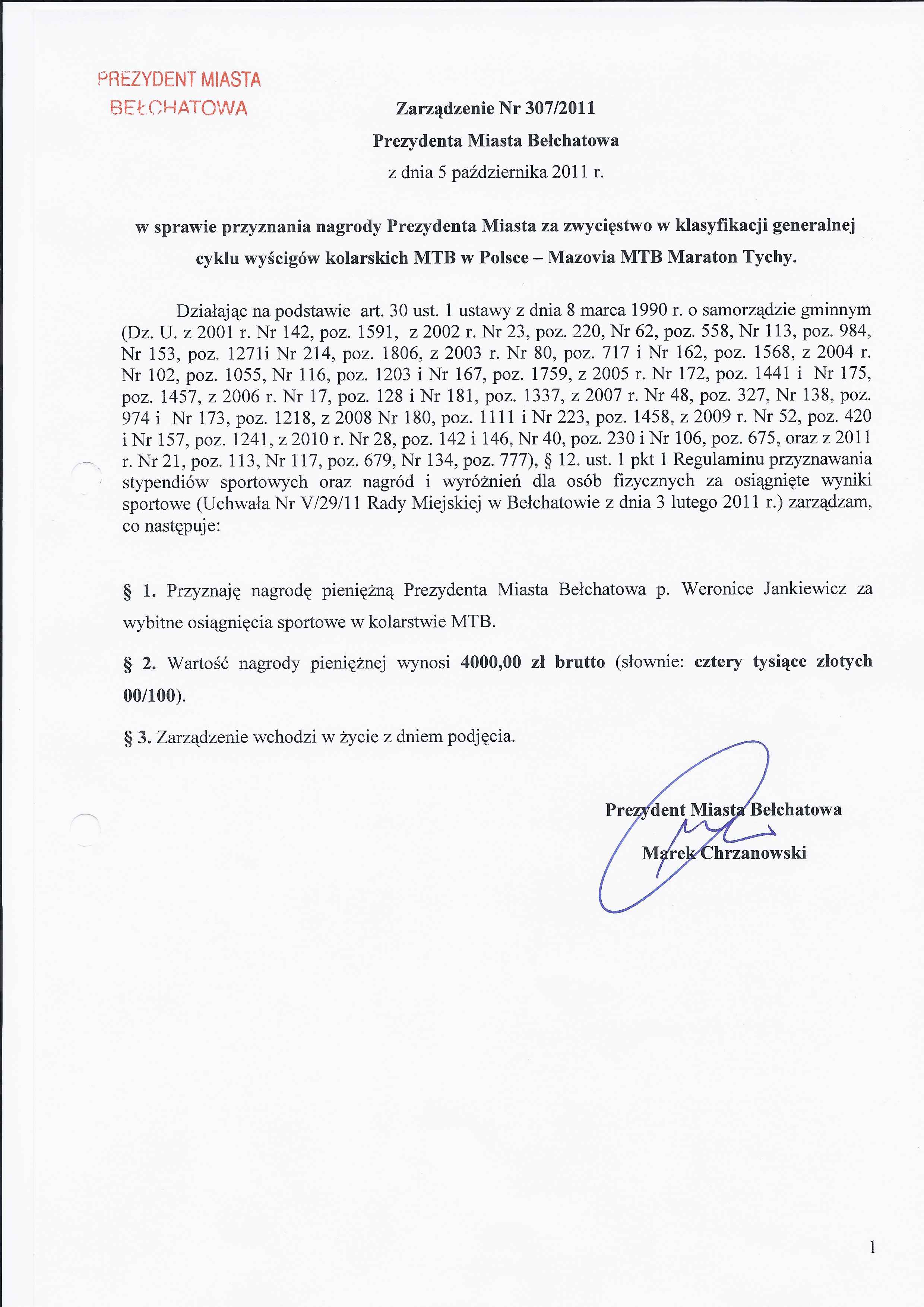Zarządzenie Nr 307 z dnia 5 października 2011 r. w/s przyznania nargody Prezydenta Miasta za zwycięstwo w klasyfikacji generalnej cyklu wyścigów kolarskich MTB w Polsce - Mazovia MTB Maraton Tychy