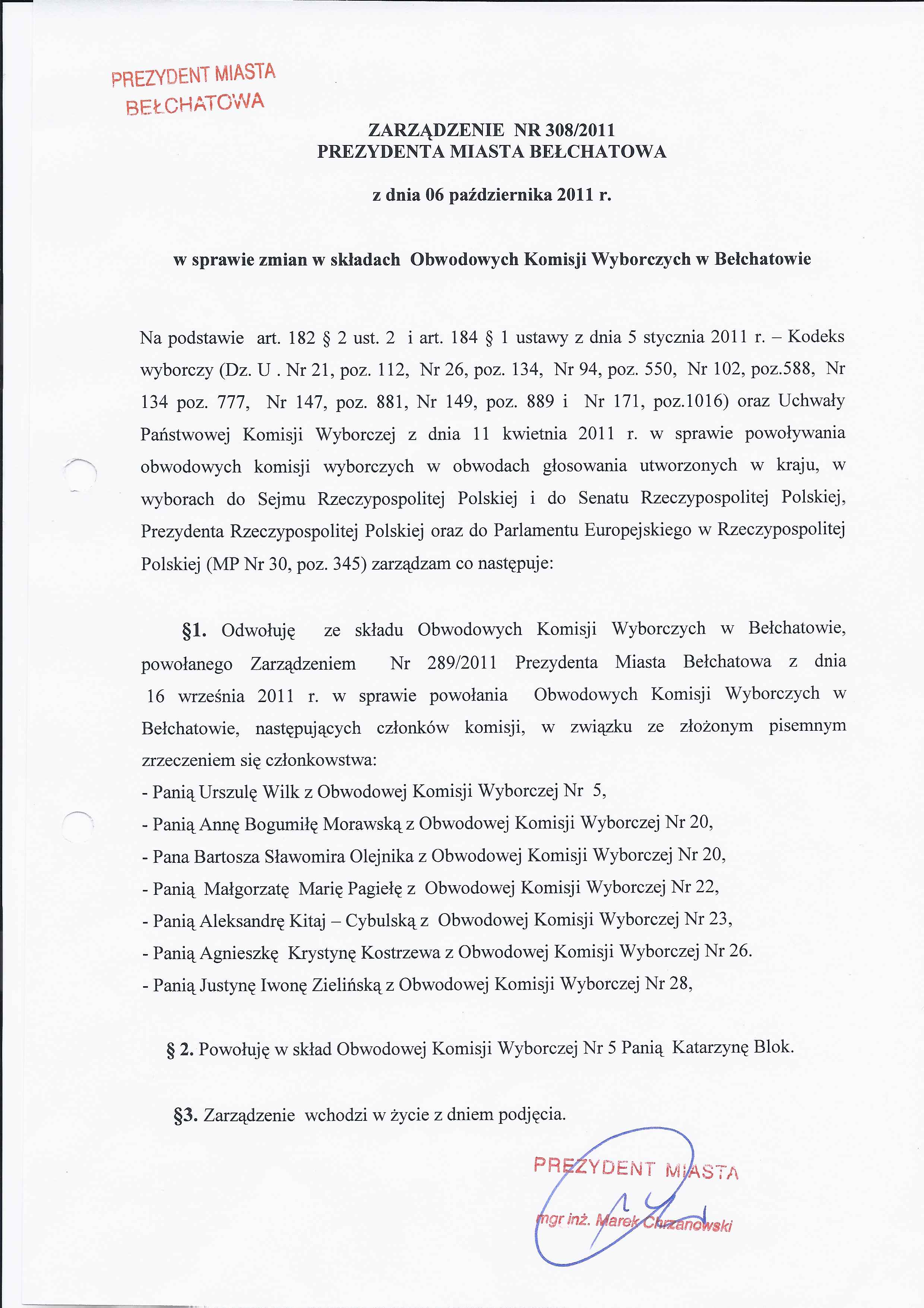 Zarządzenie Nr 308 z dnia 6 października 2011 r. w/s zmian w składach Obwodowych Komisji Wyborczych w Bełchatowie