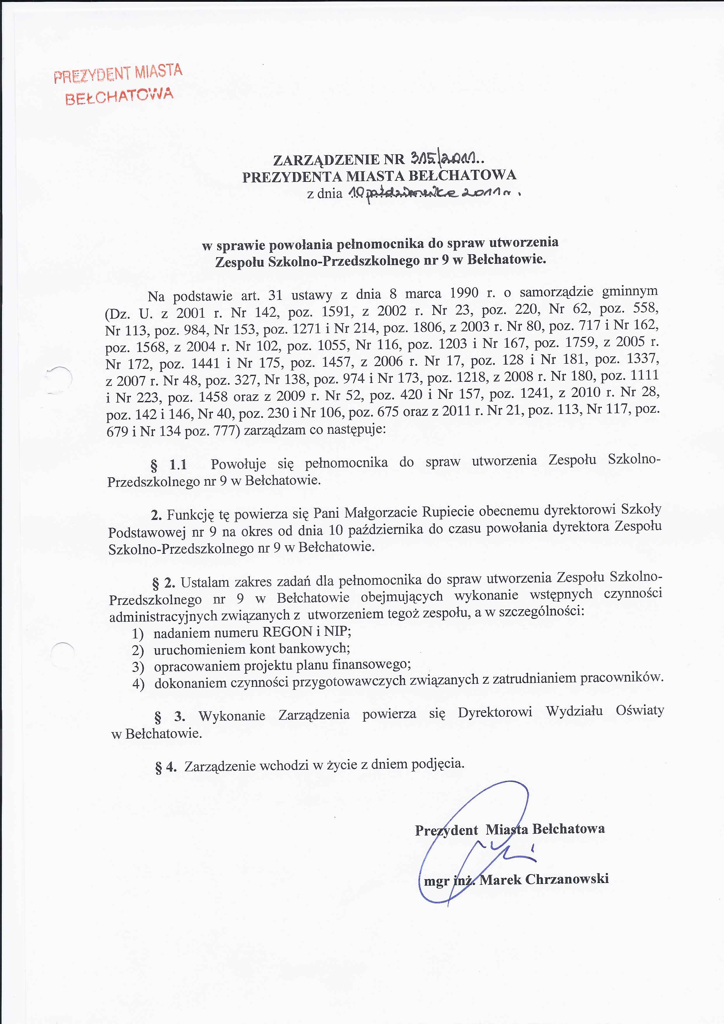 Zarządzenie Nr 315 z dnia 10 października 2011 r. w/s powołania pełnomocnika do spraw utworzenia Zespołu Szkolno-Przedszkolnego nr 9 w Bełchatowie