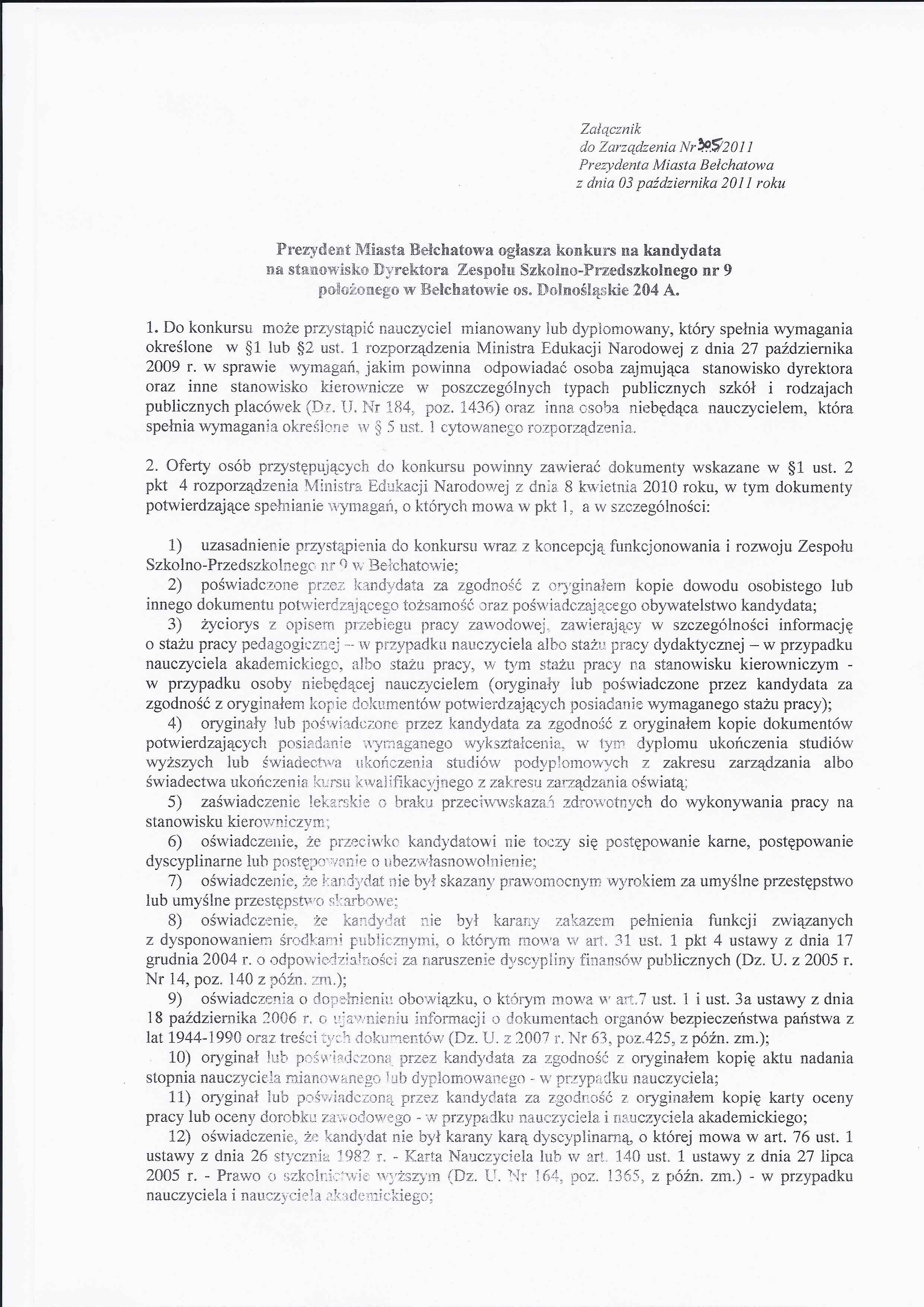 Zarządzenie Nr 305 z dnia 3 października 2011 r. w/s ogłoszenia konkursu na kandydata na stanowisko dyrektora Zespołu Szkolno-Przedszkolnego nr 9 w Bełchatowie