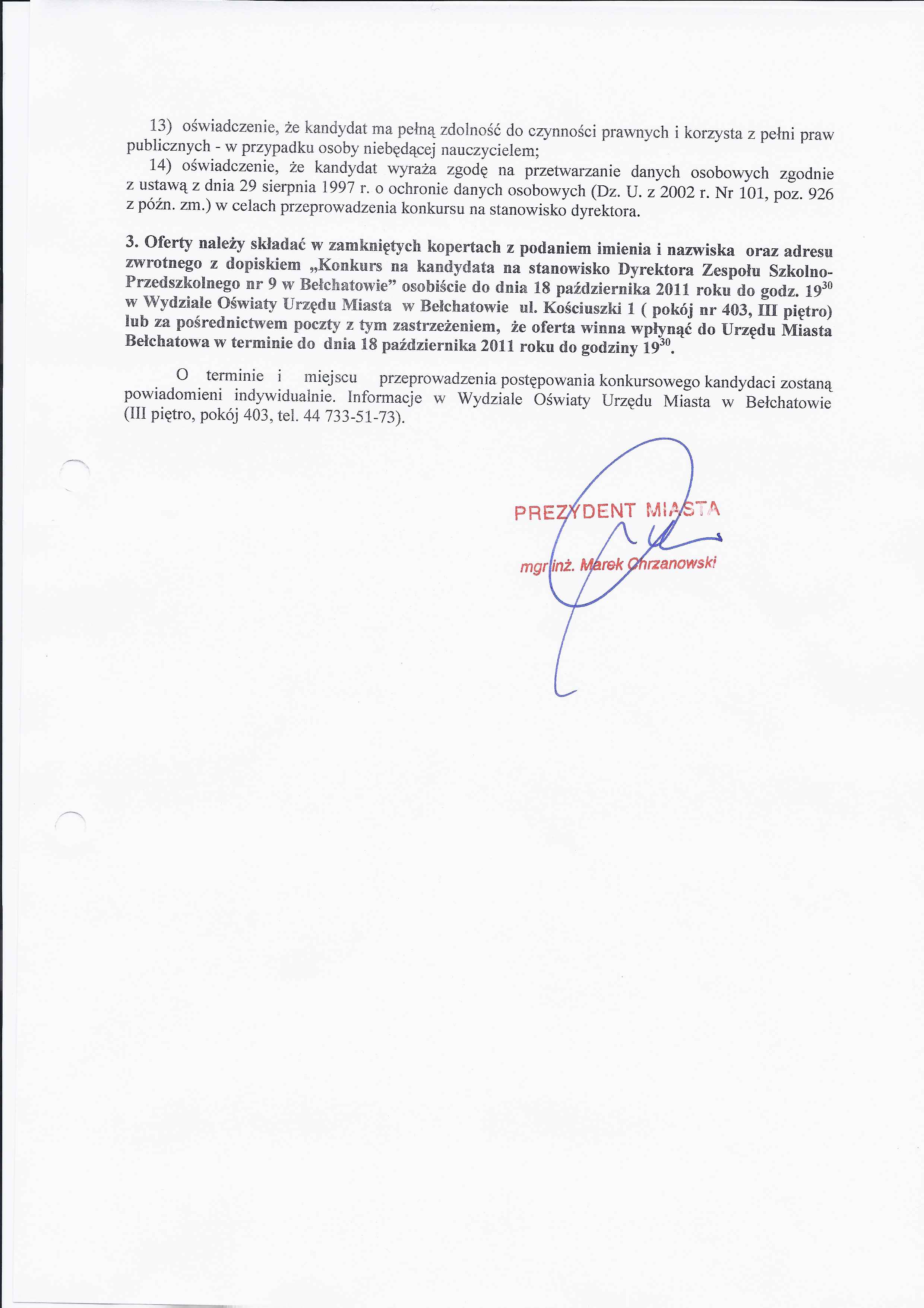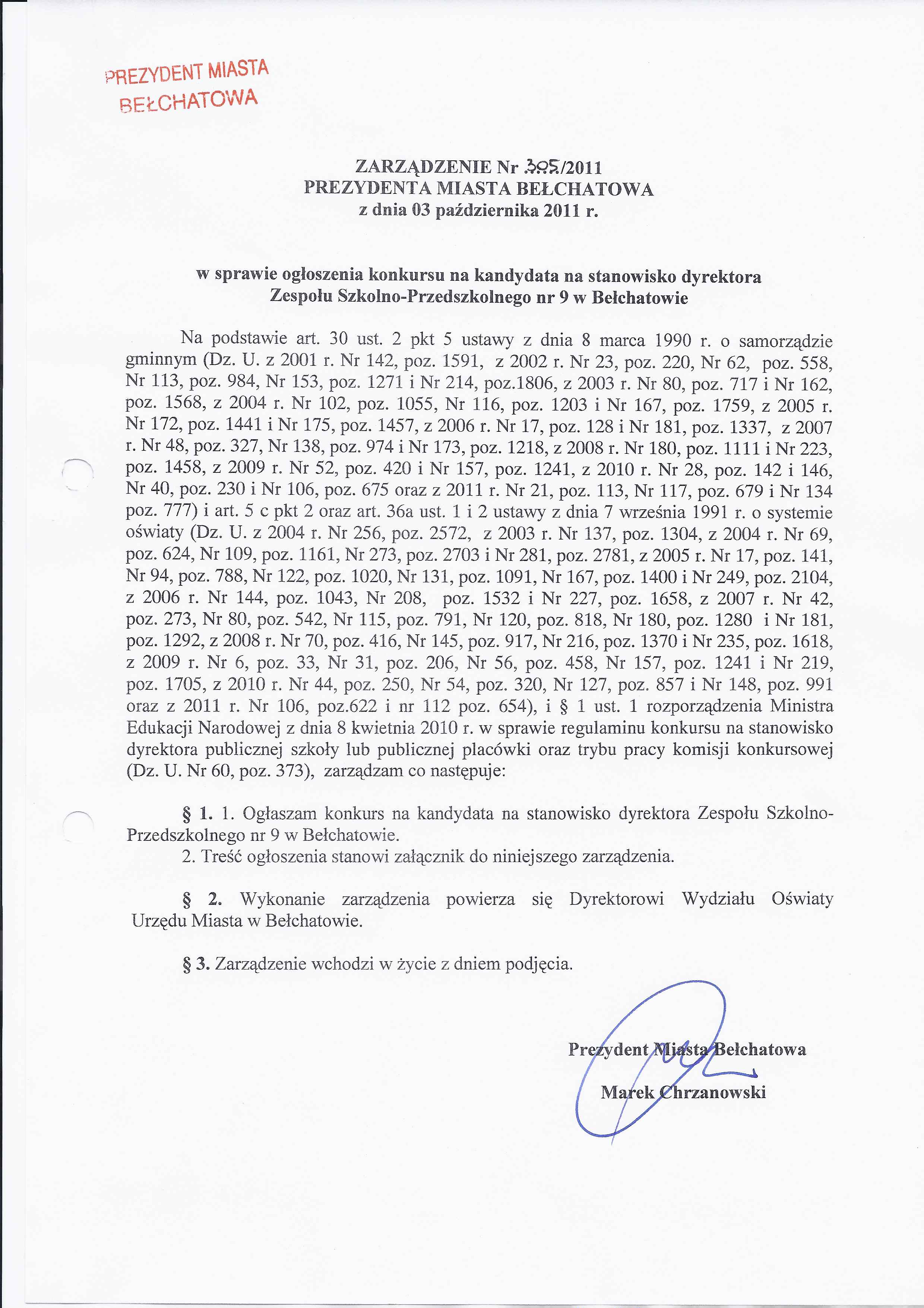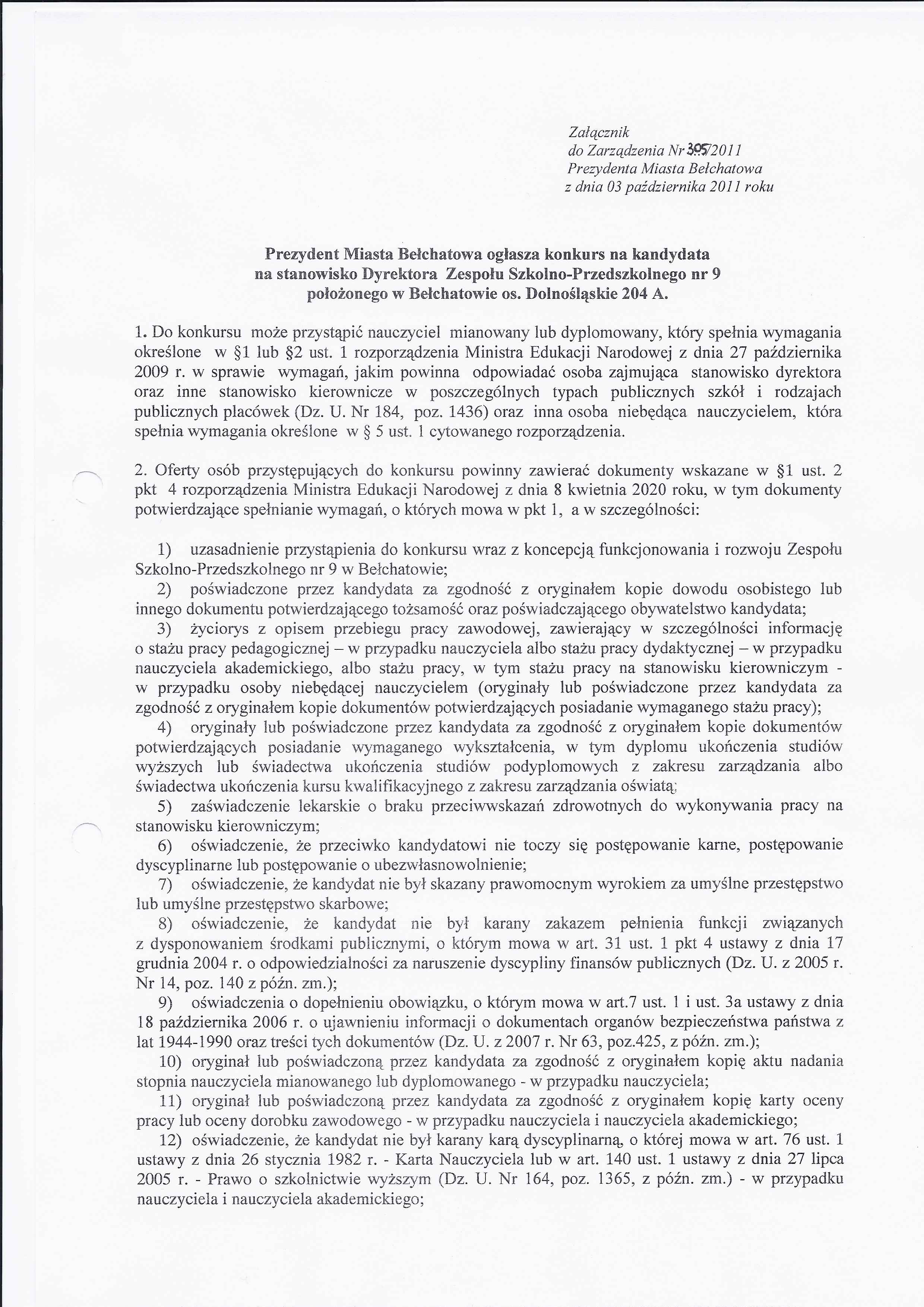 Zarządzenie Nr 305 z dnia 3 października 2011 r. w/s ogłoszenia konkursu na kandydata na stanowisko dyrektora Zespołu Szkolno-Przedszkolnego nr 9 w Bełchatowie