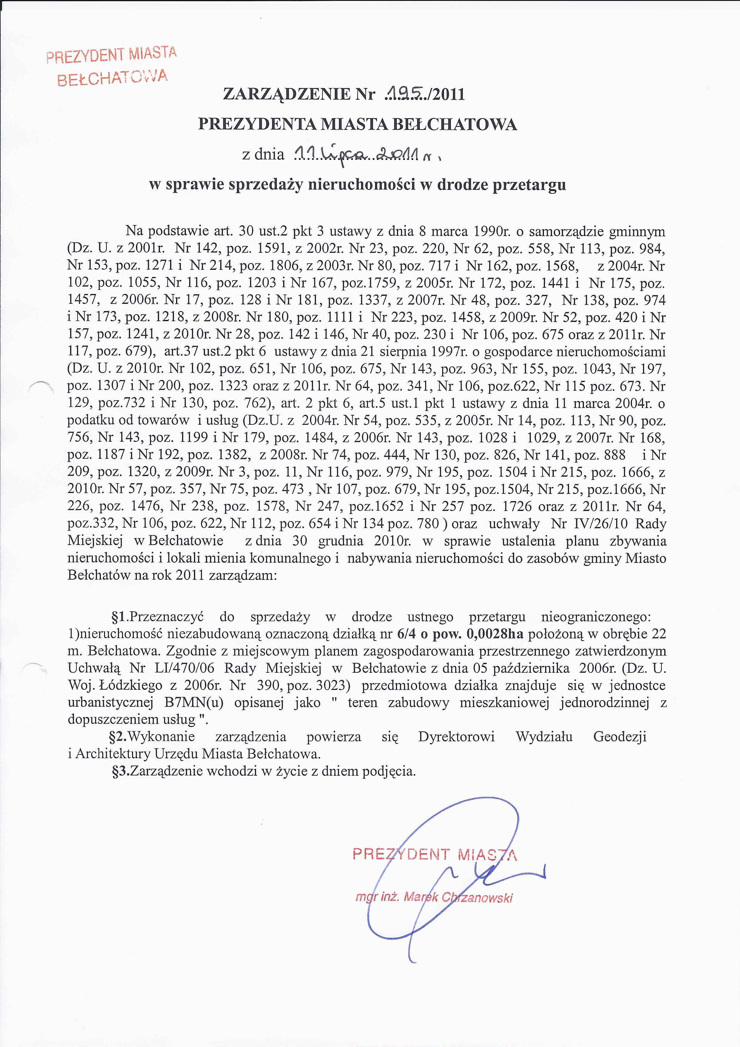 Zarządzenie Nr 195 z dnia 11 lipca 2011 r. w/s sprzedaży nieruchomości w drodze przetargu