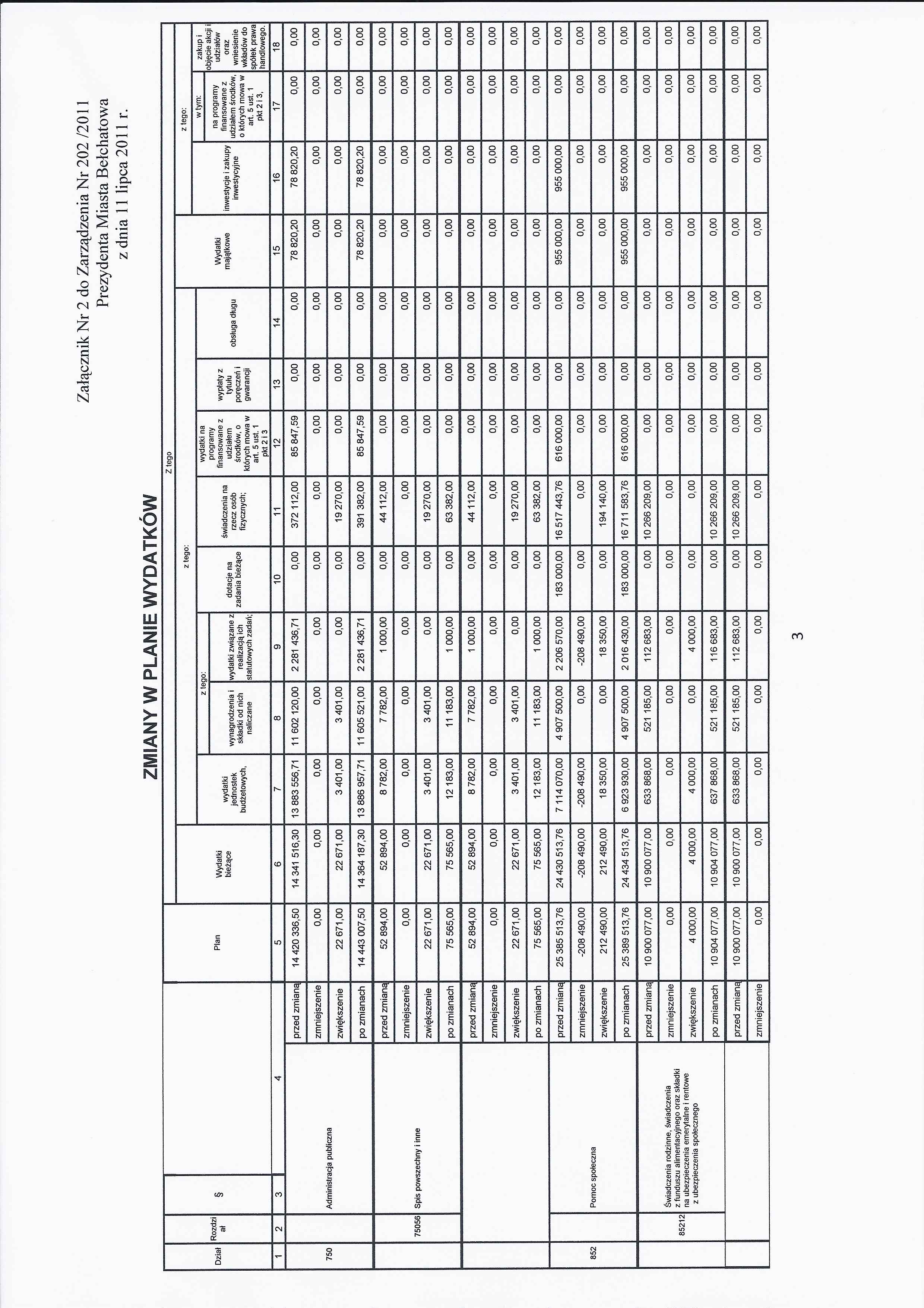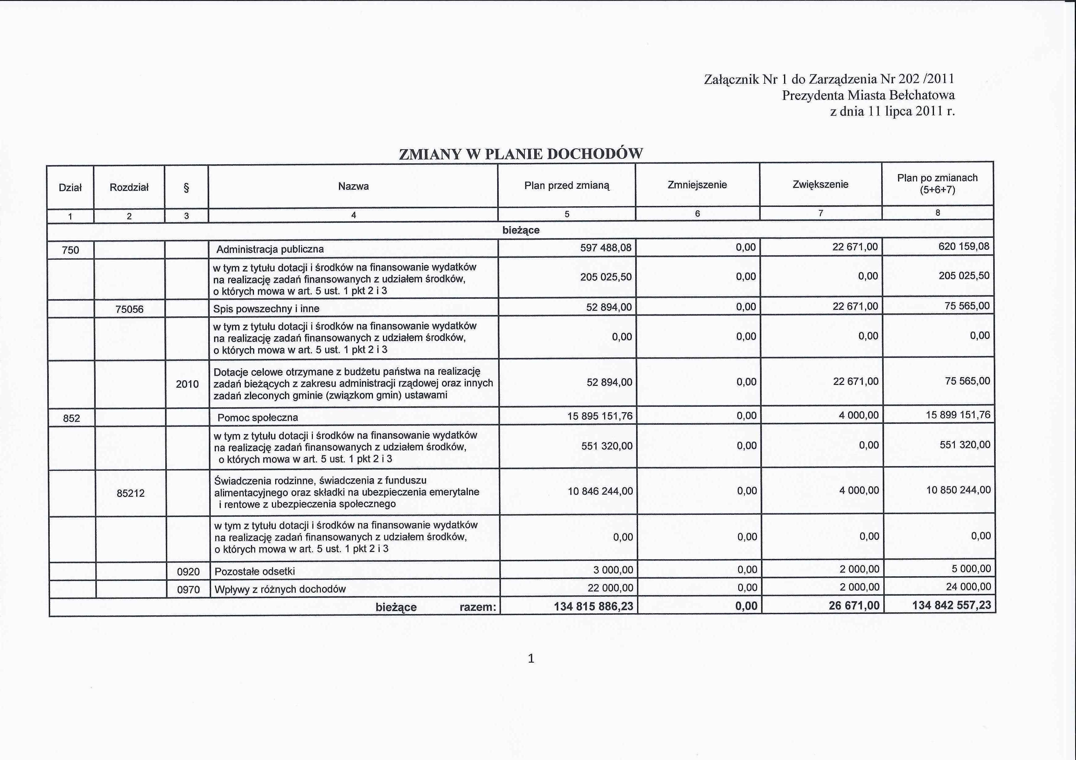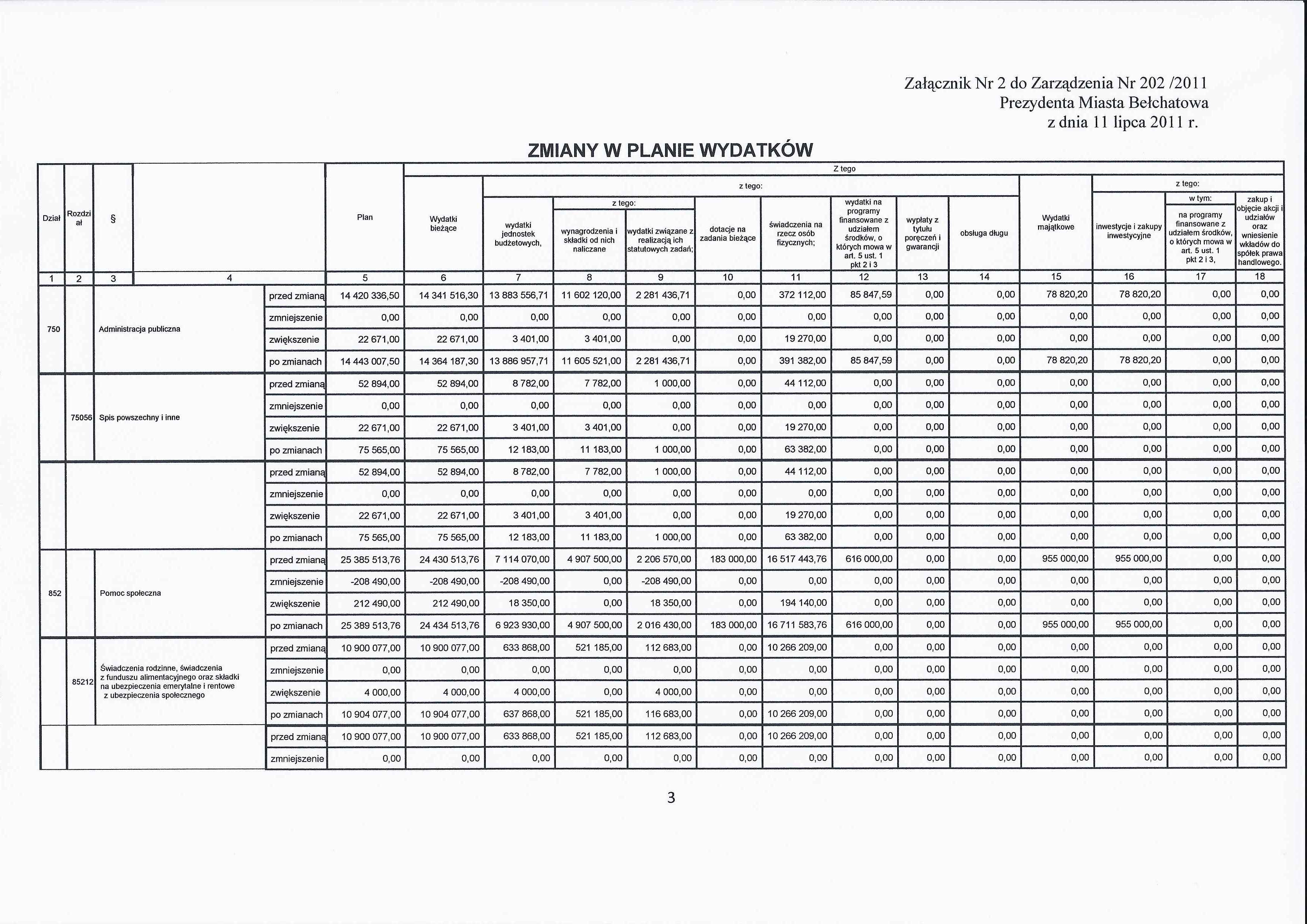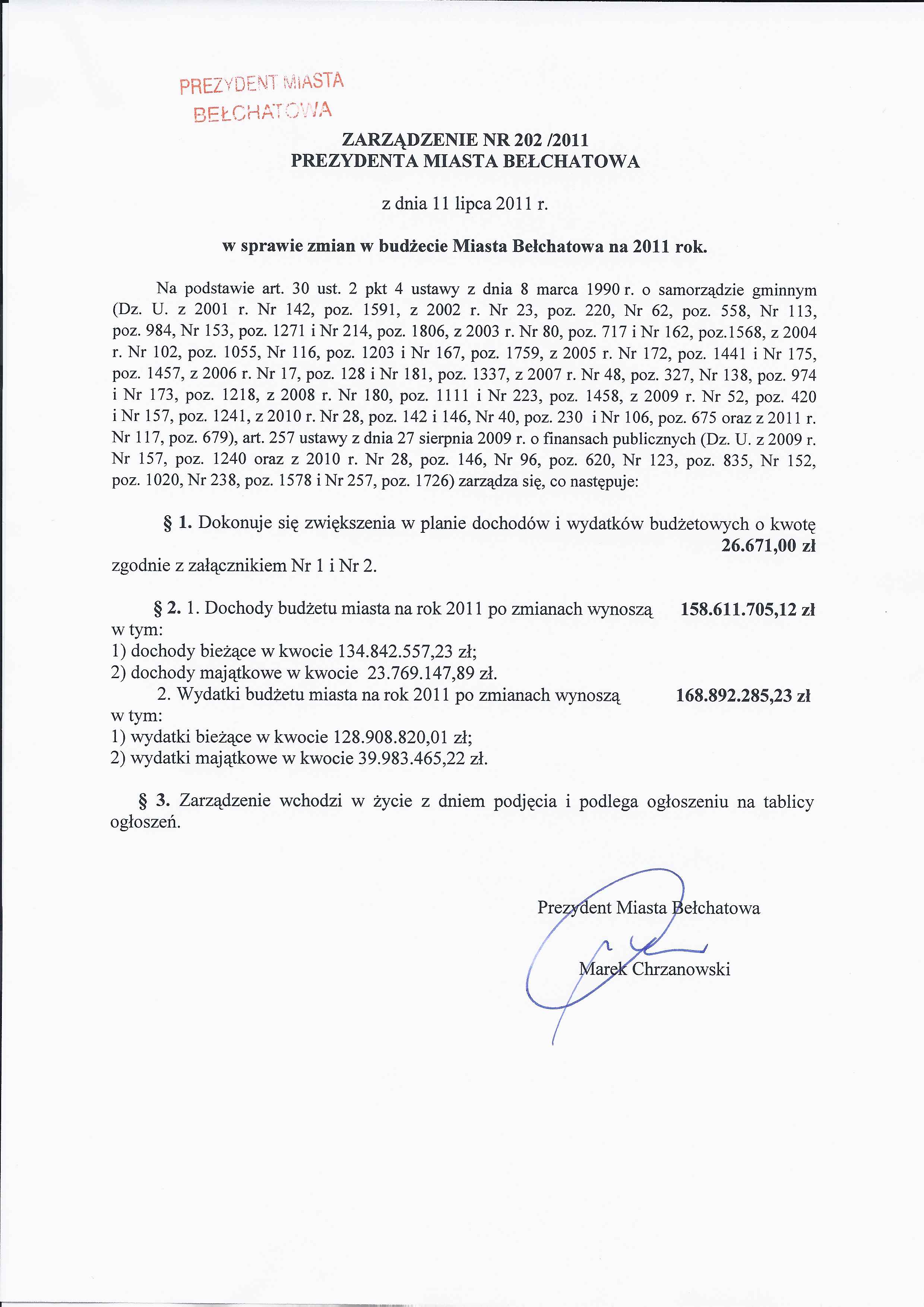 Zarządzenie Nr 202 z dnia 11 lipca 2011 r. w/s zmian w budżecie Miasta Bełchatowa na 2011 rok