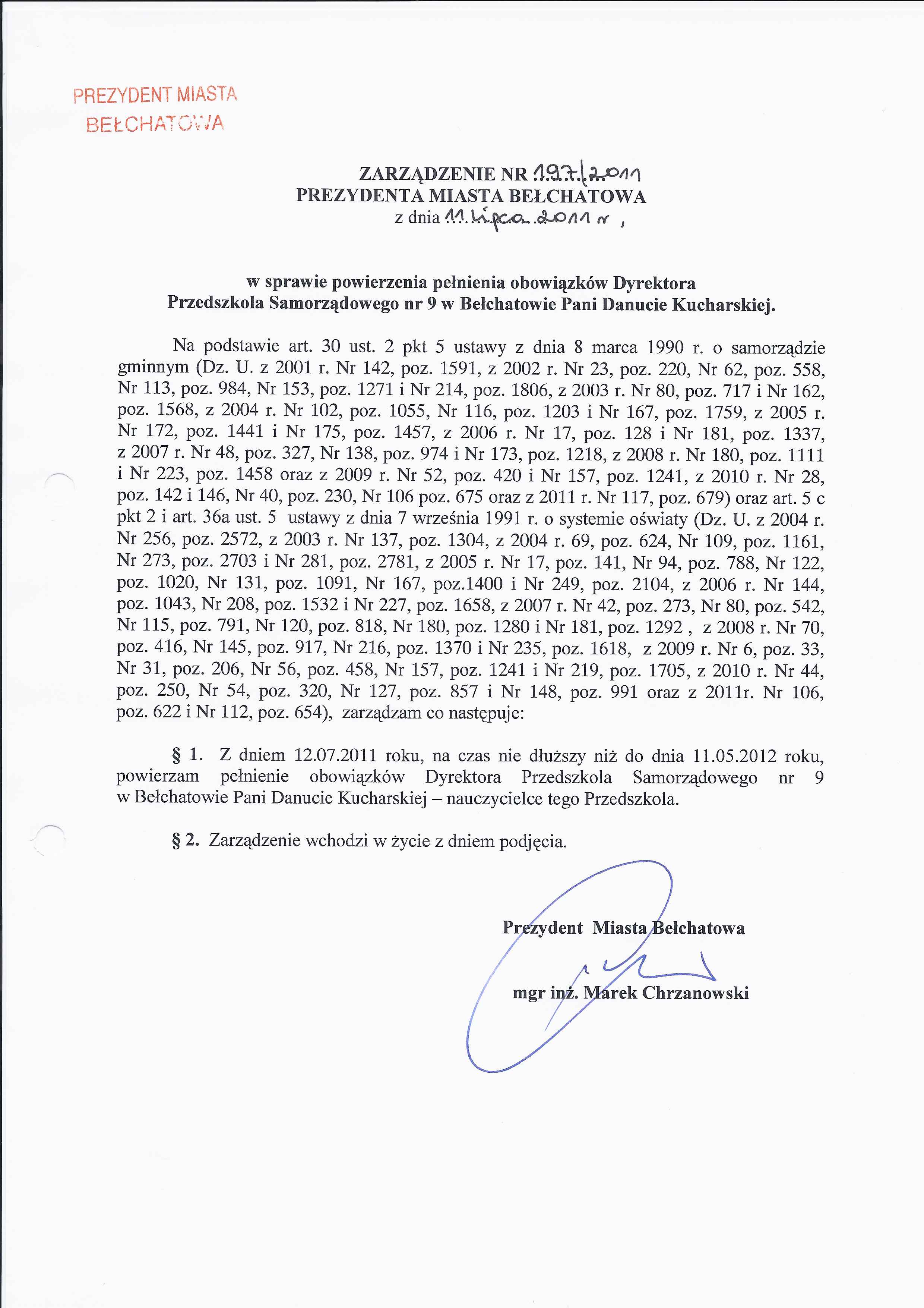 Zarządzenie Nr 197 z dnia 11 lipca 2011 r. w/s powierzenia pełnienia obowiązków Dyrektora Przedszola Samorządowego nr 9 w Bełchatowie Pani Danucie Kucharskiej