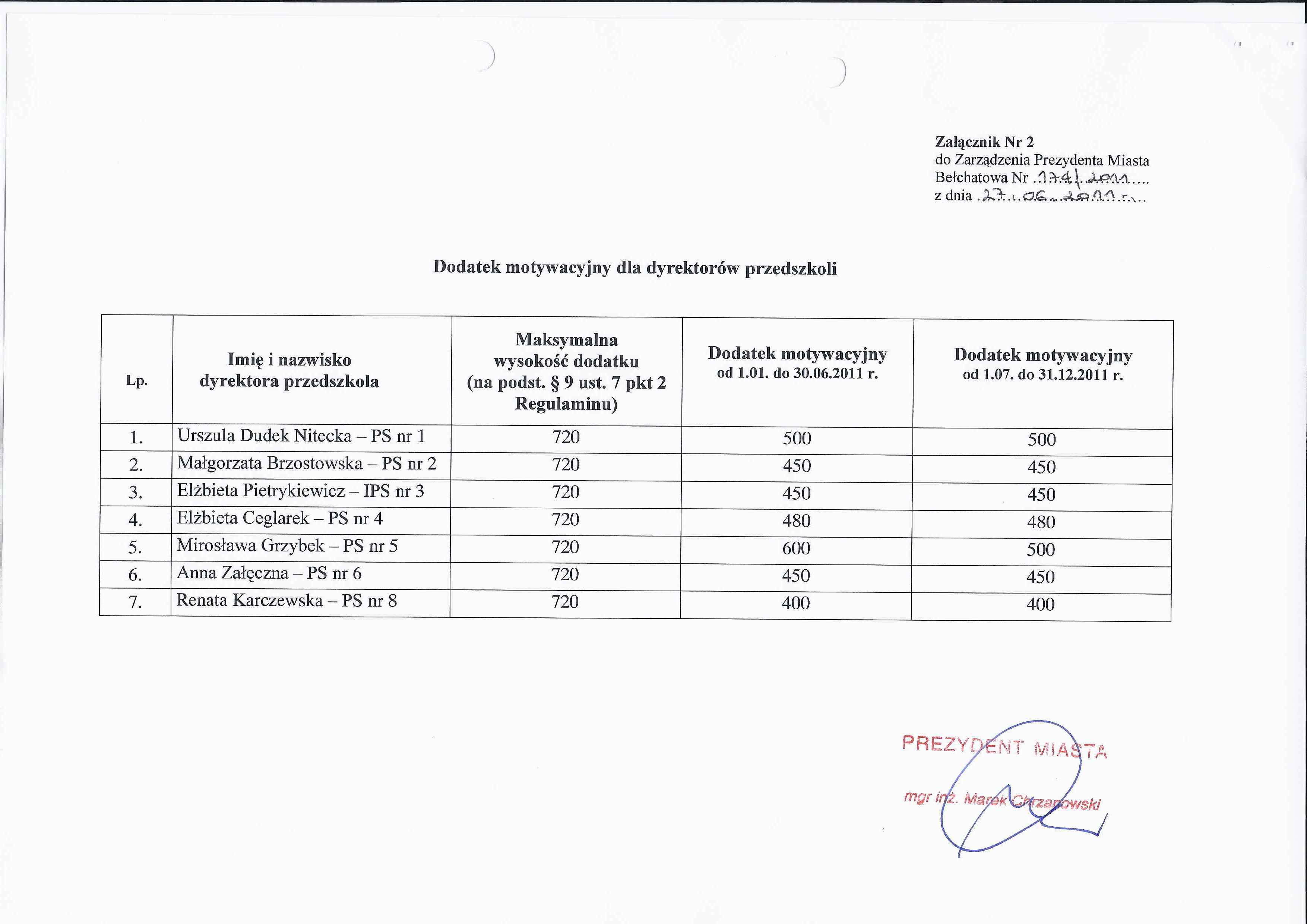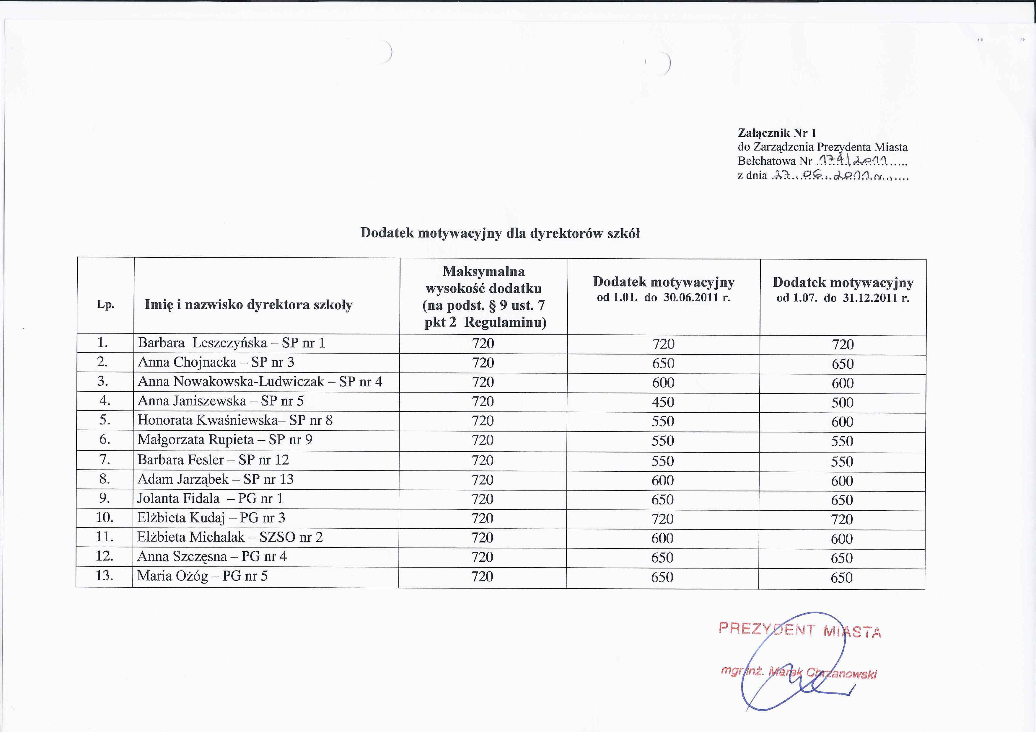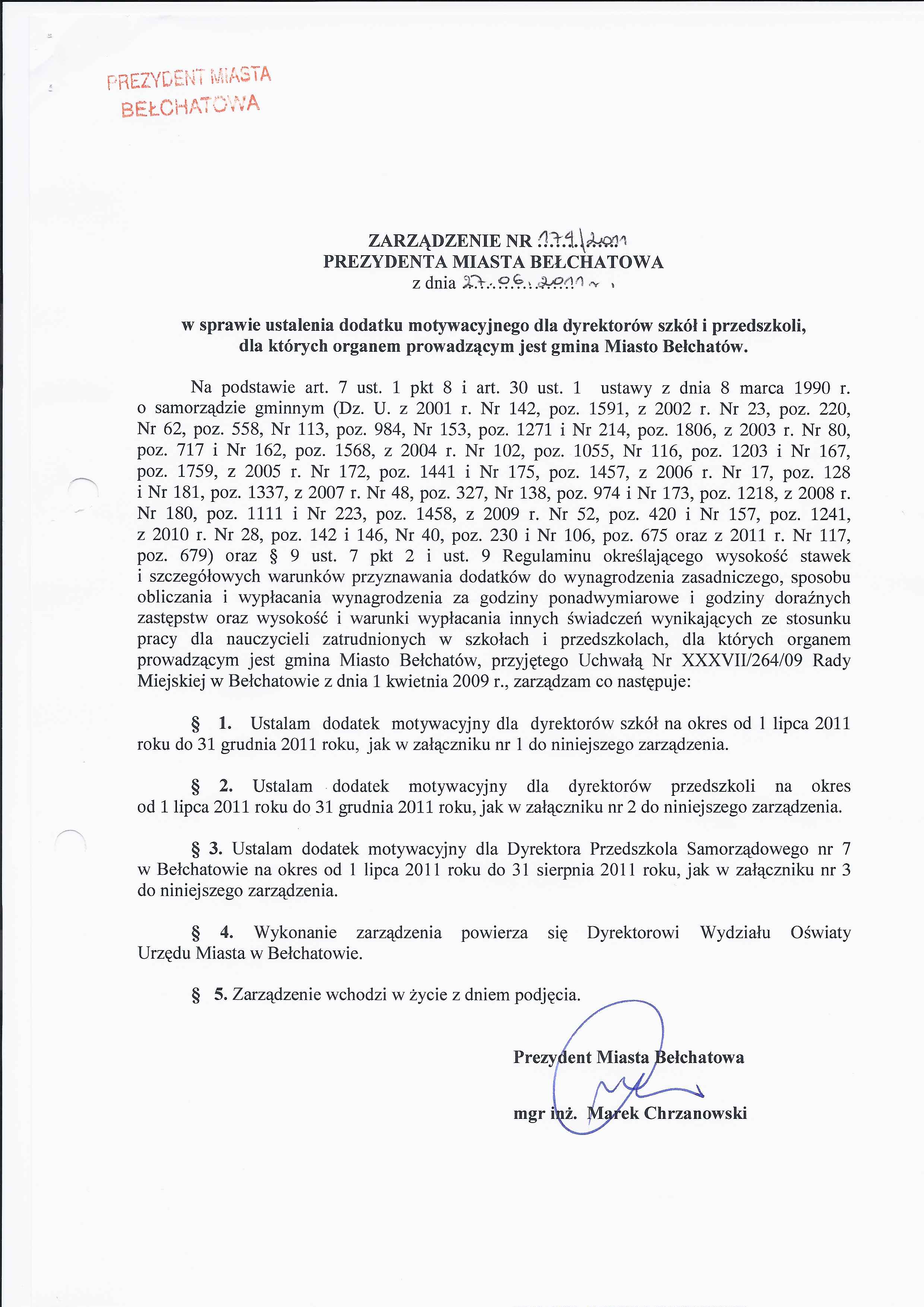 Zarządzenie Nr 174 z dnia 27 czerwca 2011 r. w/s ustalenia dodatku motywacyjnego dla dyrektorów szkół i przedszkoli, dla których organem prowadzącym jest gmina Miasto Bełchatów