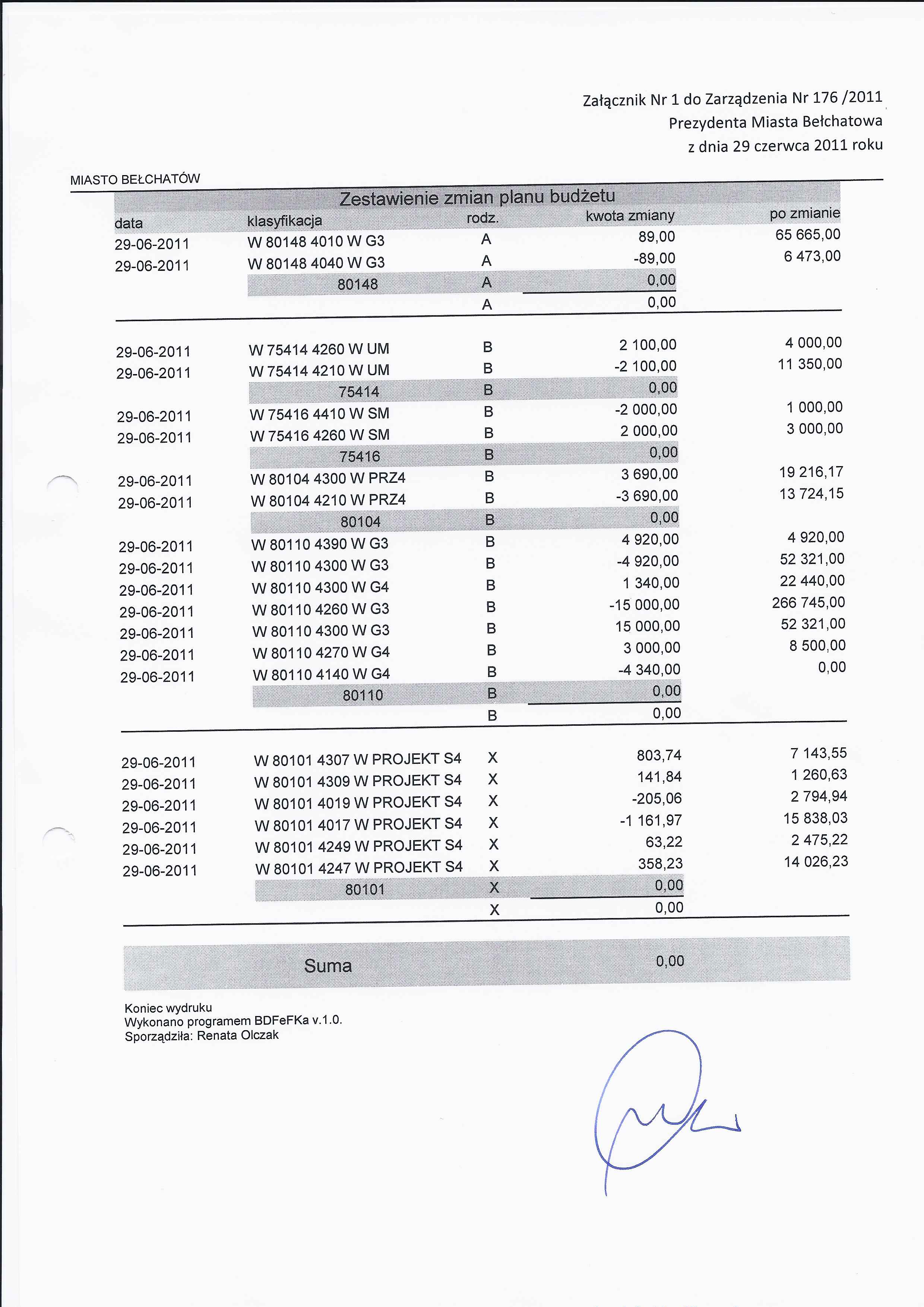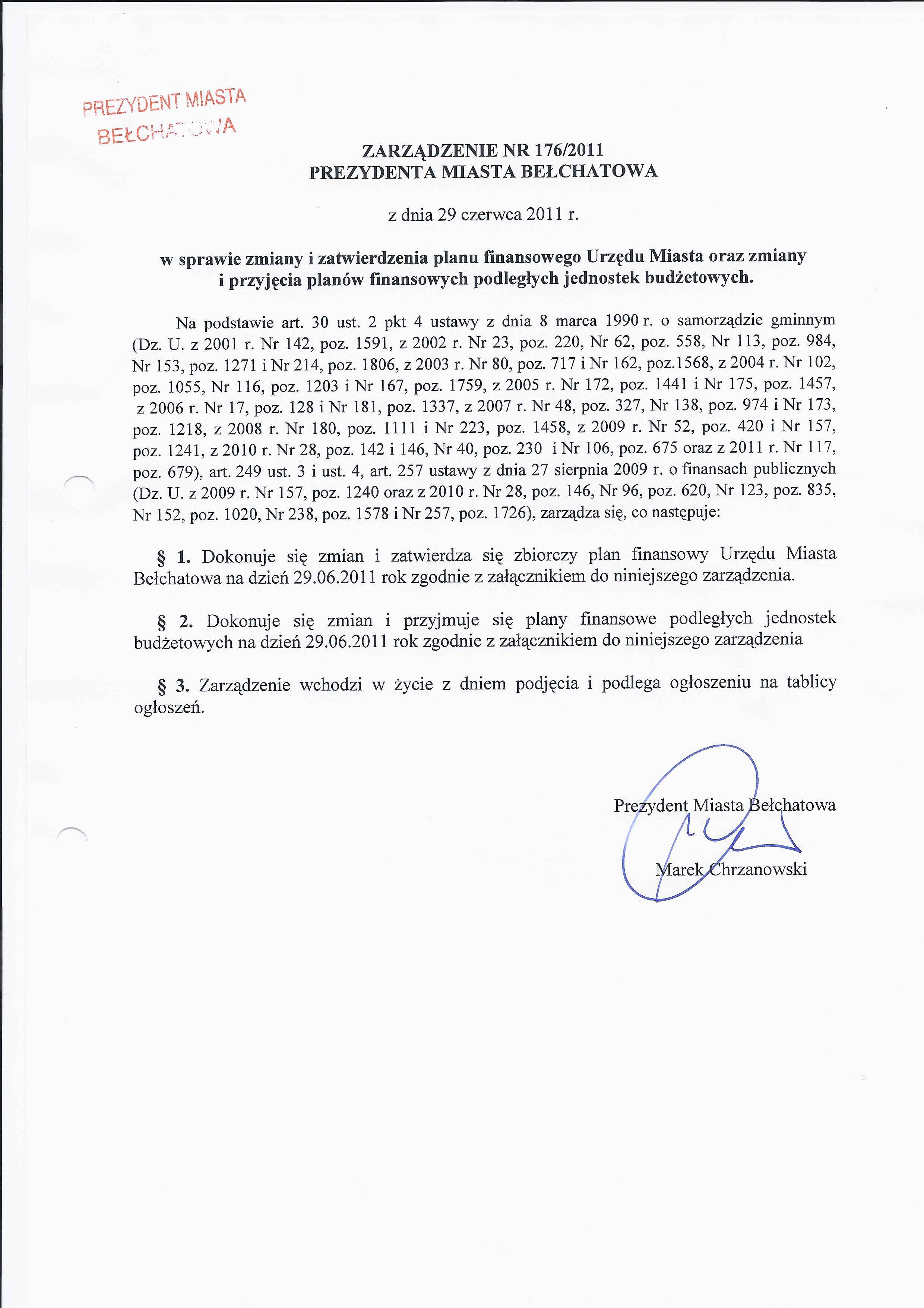 Zarządzenie Nr 176 z dnia 29 czerwca 2011 r. w/s zmiany i zatwierdzenia planu finansowego Urzędu Miasta oraz zmiany i przyjęcia planów finansowych podległych jednostek budżetowych