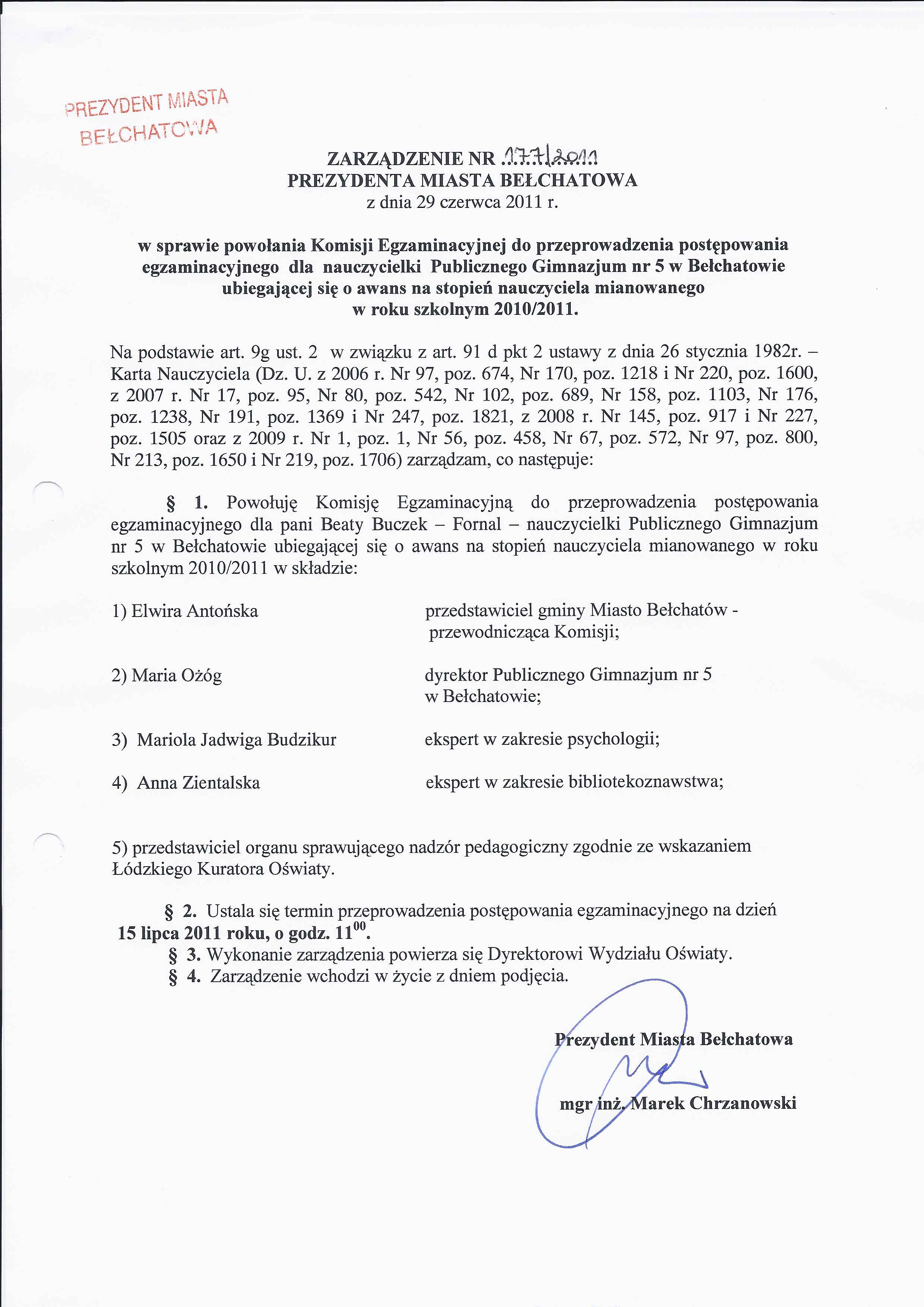 Zarządzenie Nr 177 z dnia 29 czerwca 2011 . w/s powołania Komisji Egzaminacyjnej do przeprowadzenia postępowania egzaminacyjnego dla nauczycielki Publicznego Gimnazjum nr 5 w Bełchatowie ubiegającej się o awans na stopień nauczyciela mianowanego w roku szkolnym 2010/2011