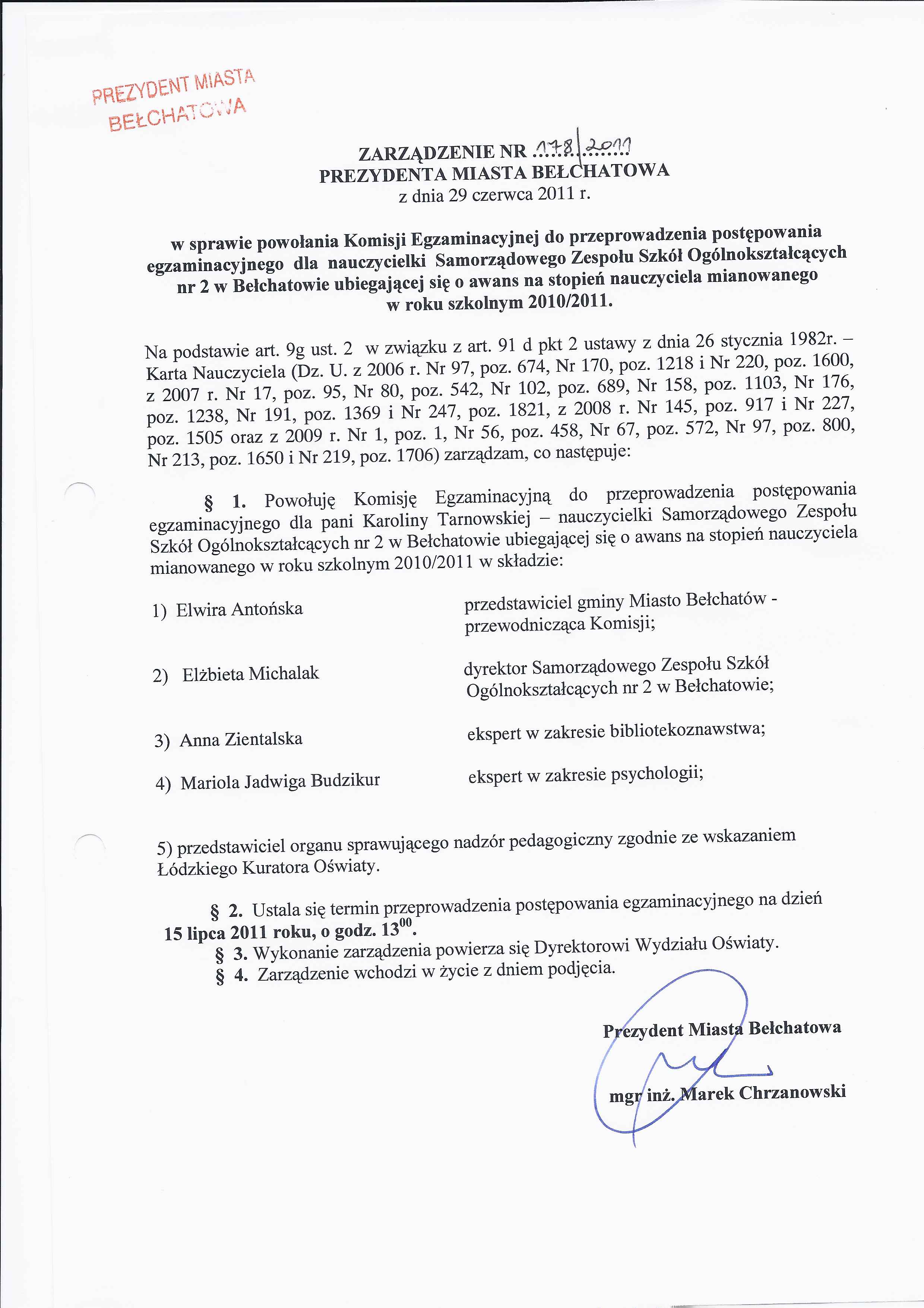 Zarządzenie Nr 178 z dnia 29 czerwca 2011 r. w/s powołania Komisji Egzaminacyjnej do przeprowadzenia postępowania egzaminacyjnego dla nauczycielki Samorządowego Zespołu Szkół Ogólnokształcących nr 2 w Bełchatowie ubiegającej się o awans na stopień nauczyciela mianowanego w roku szkolnym 2010/2011
