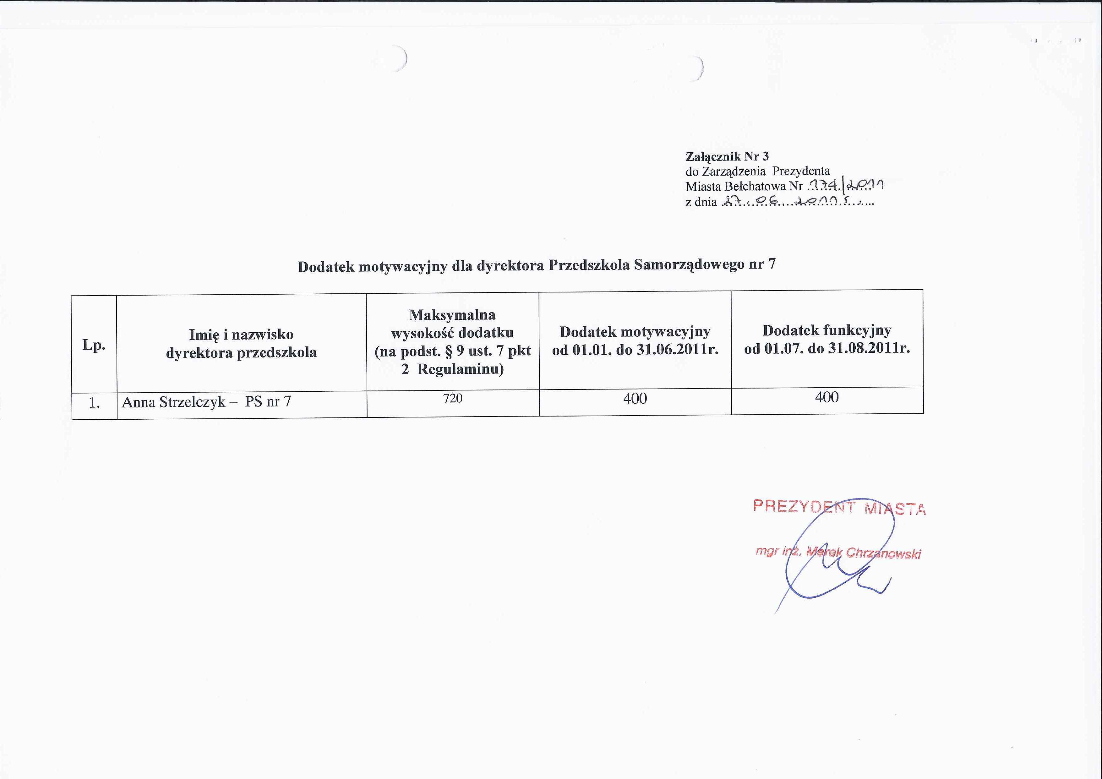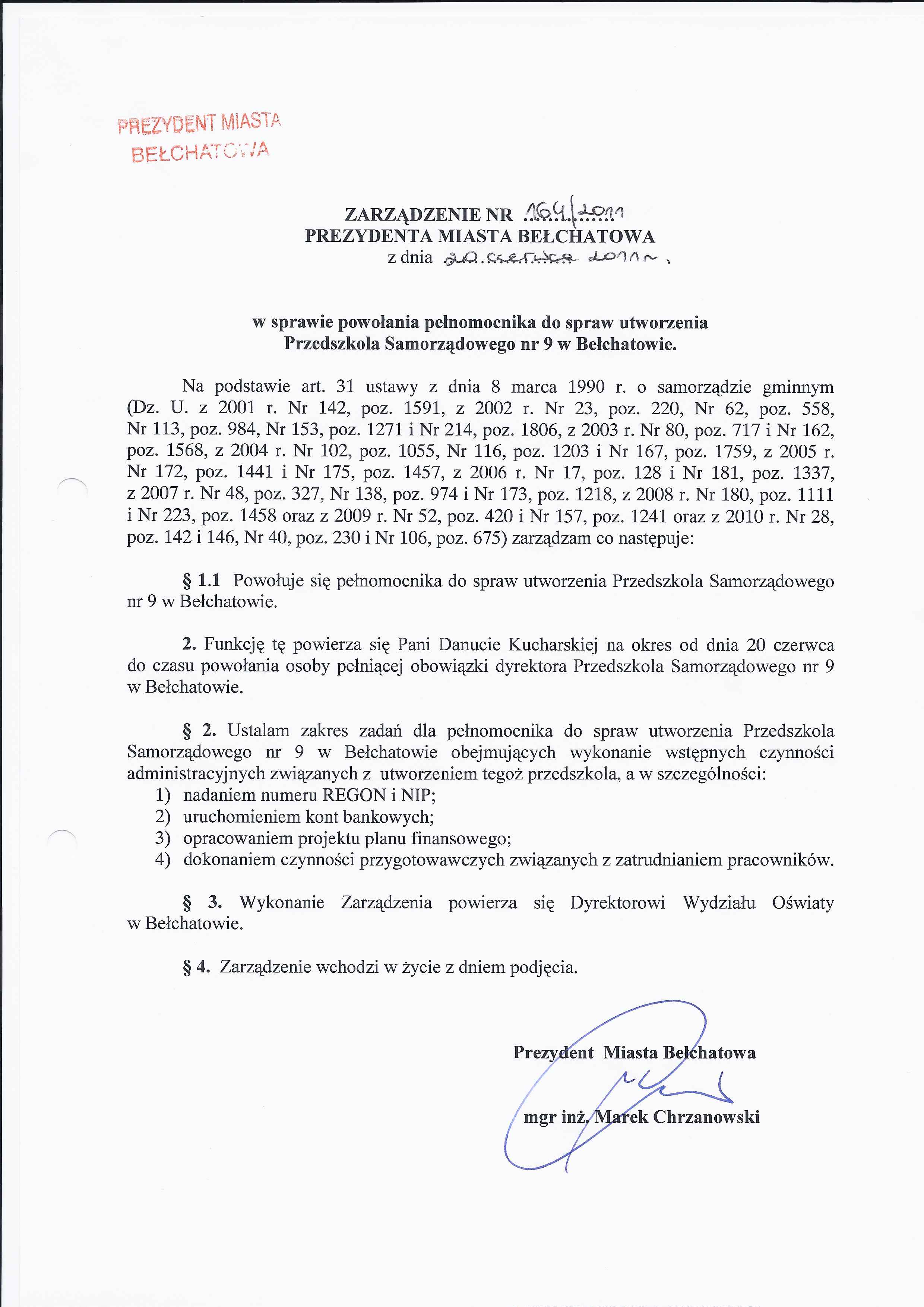 Zarządzenie Nr 164 z dnia 20 czerwca 2011 r. w/s powołania pełnomocnika do spraw utworzenia Przedszkola Samorządowego nr 9 w Bełchatowie