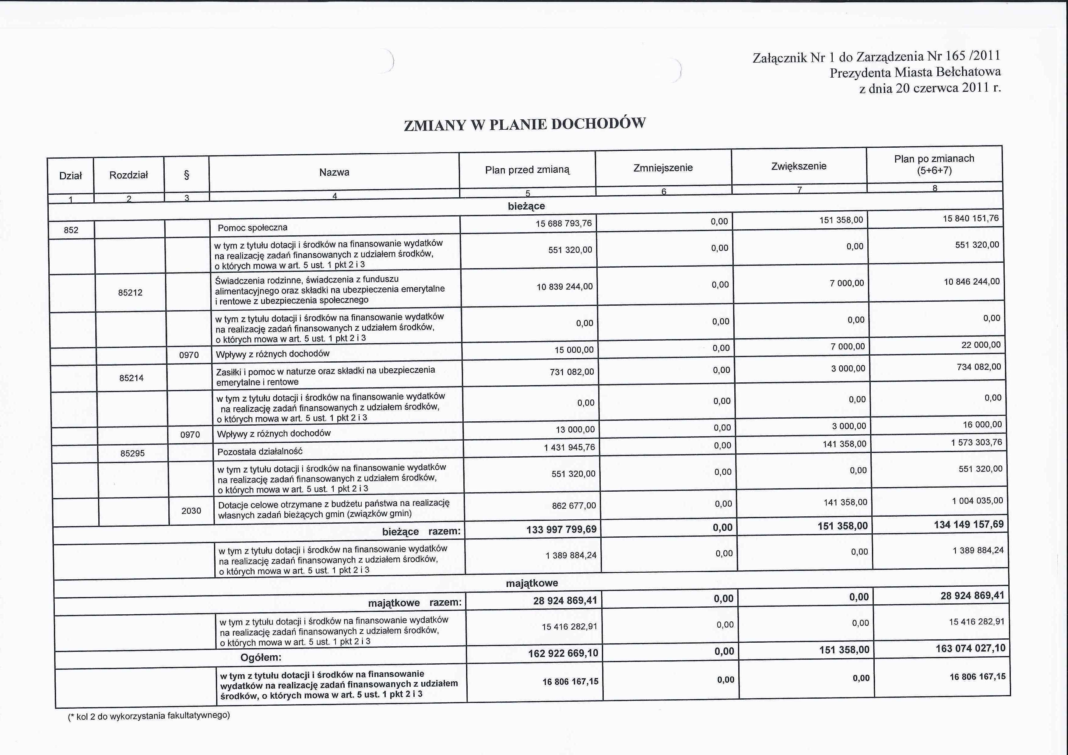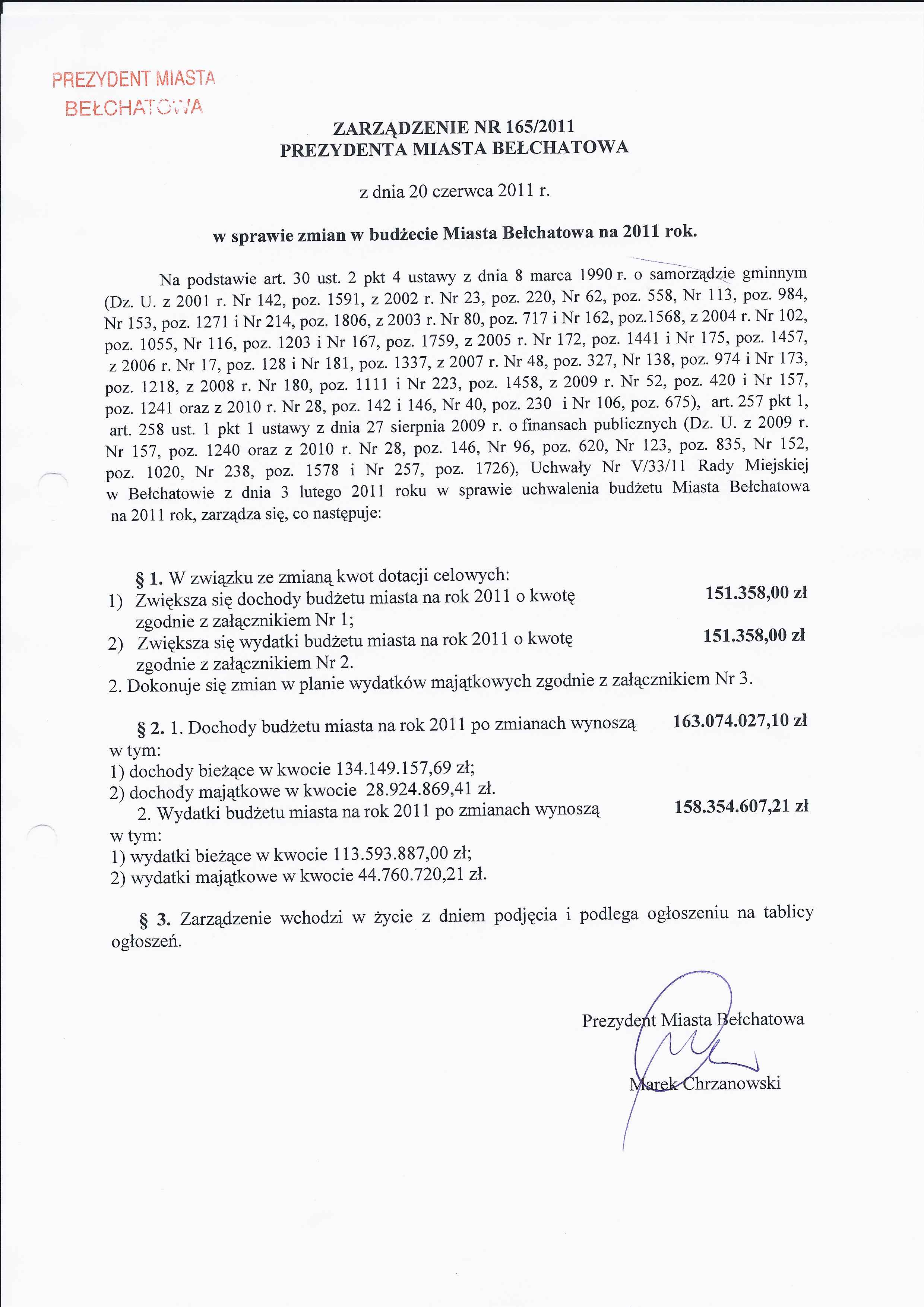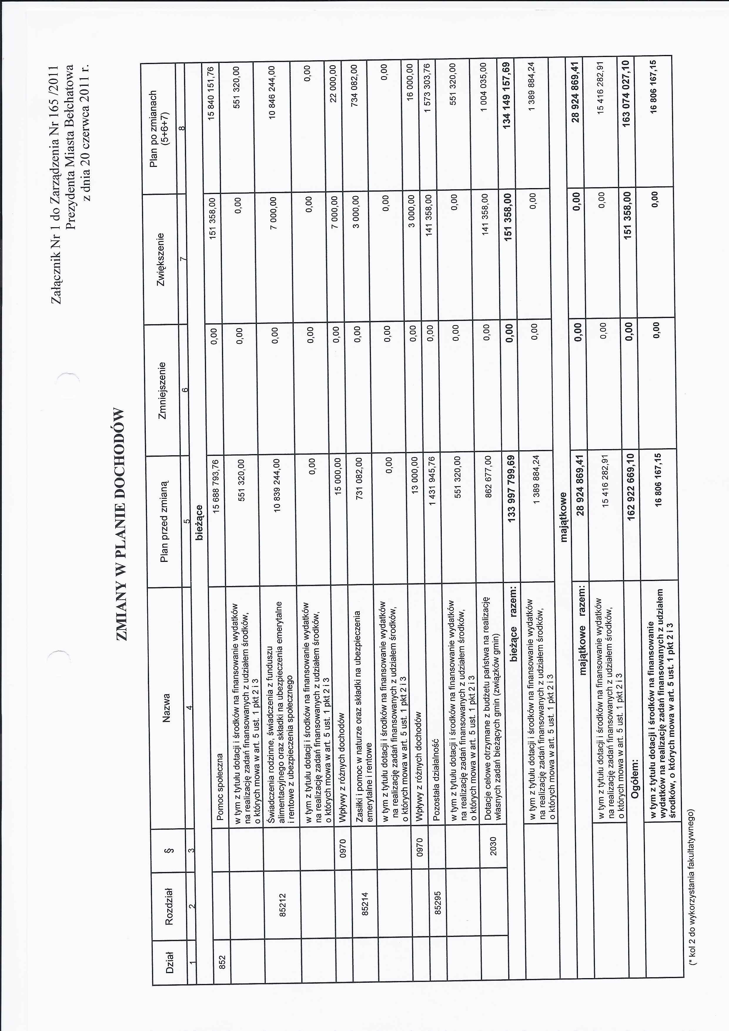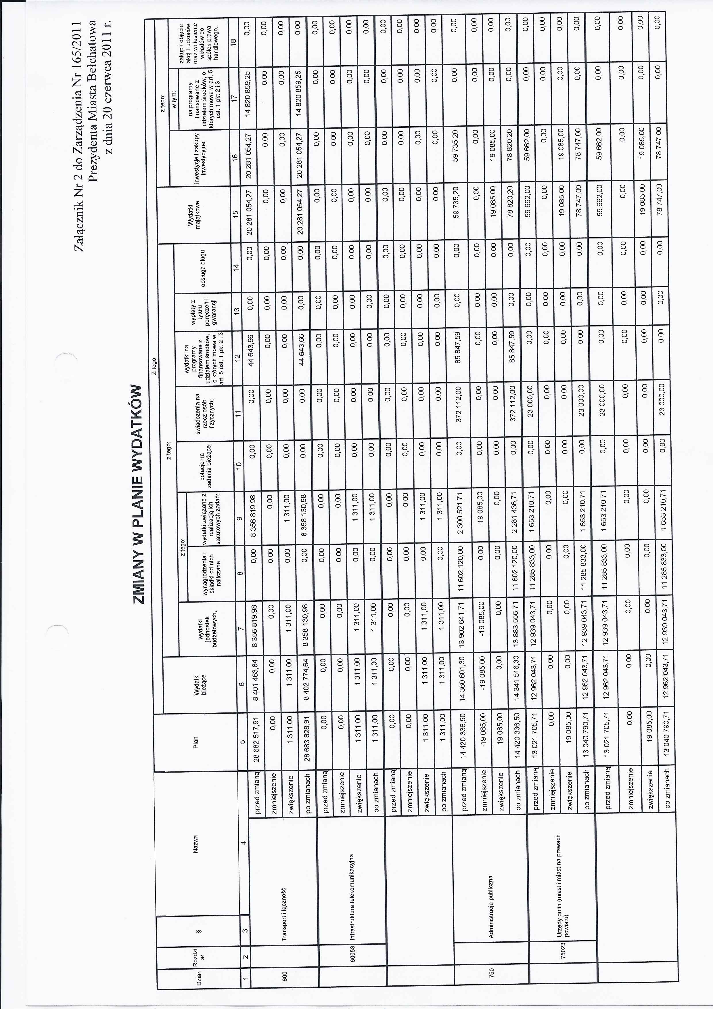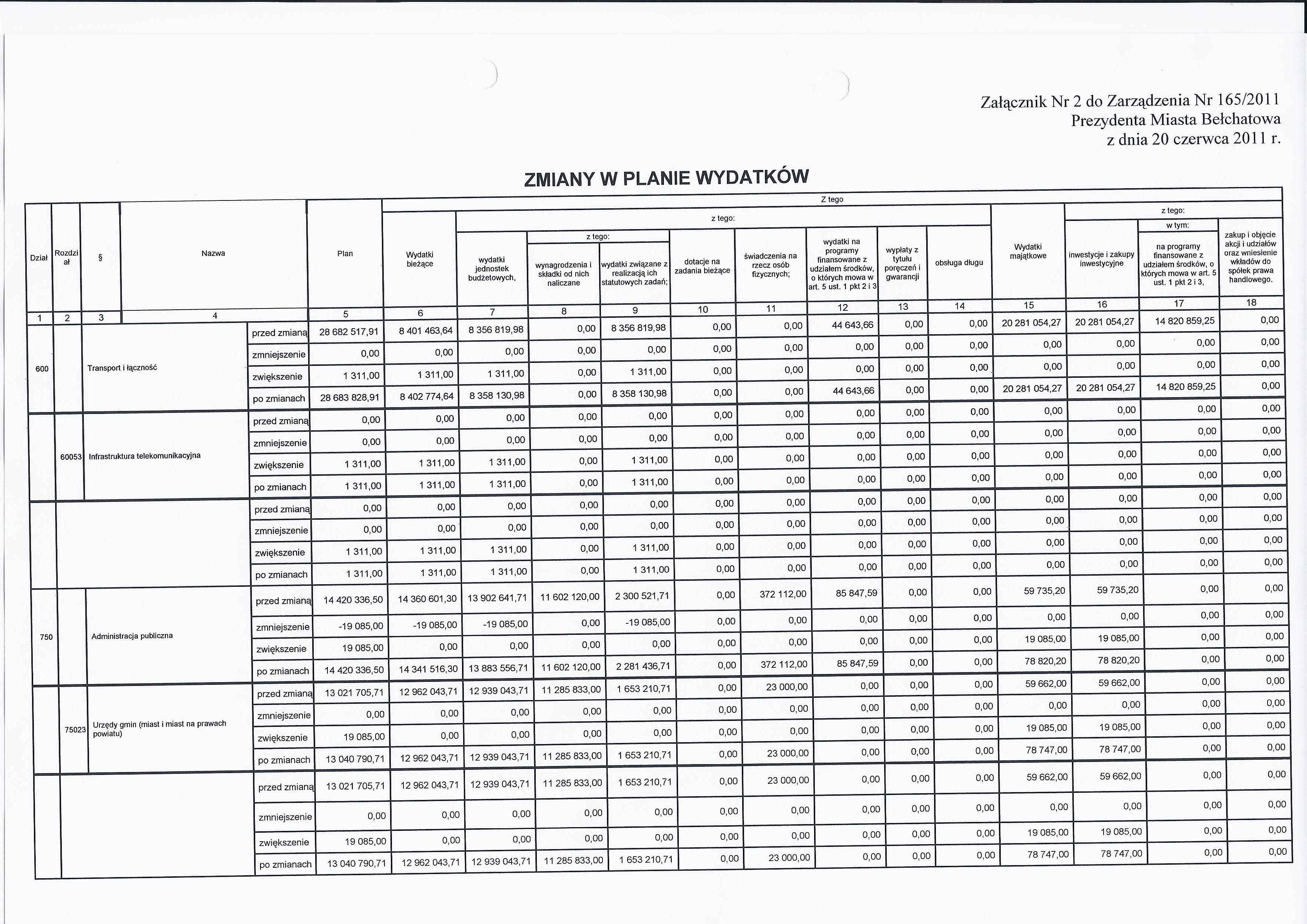 Zarządzenie Nr 165 z dnia 20 czerwca 2011 r. w/s zmian w budżecie Miasta Bełchatowa na 2011 rok