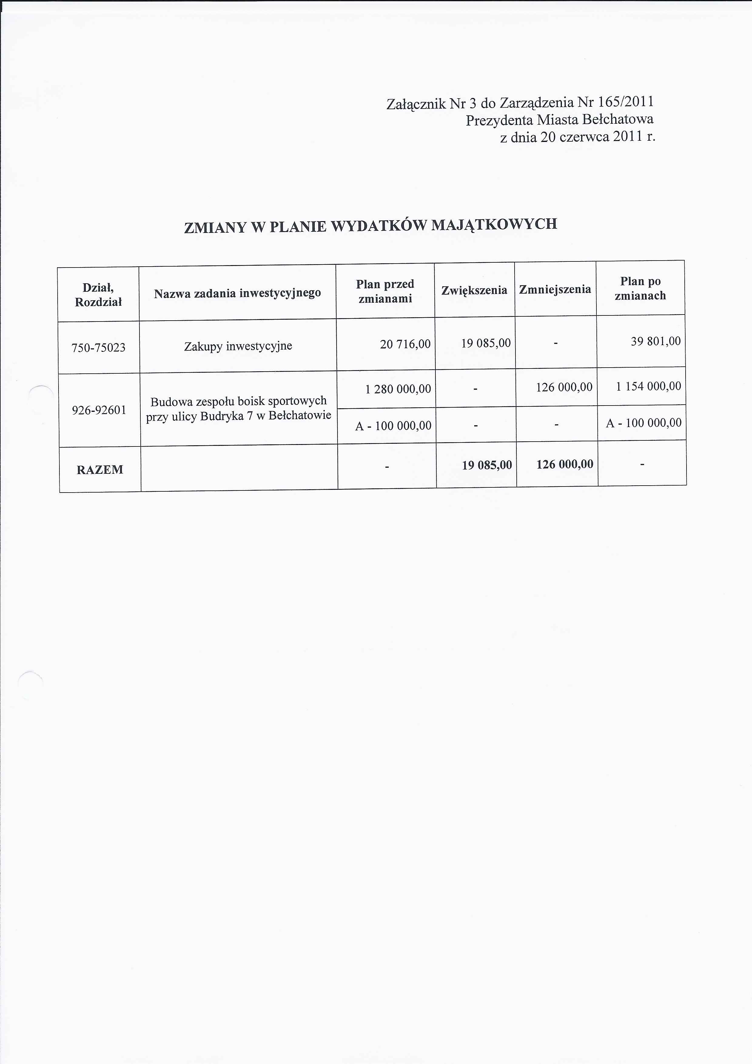 Zarządzenie Nr 169 z dnia 20 czerwca 2011 r. w/s wyrażenia zgody na fizyczną likwidację środków trwałych tj. mebli i sprzętu biurowego zgłoszonych przez Wydział Ogranizacyjny Urzędu Miasta w Bełchatowie
