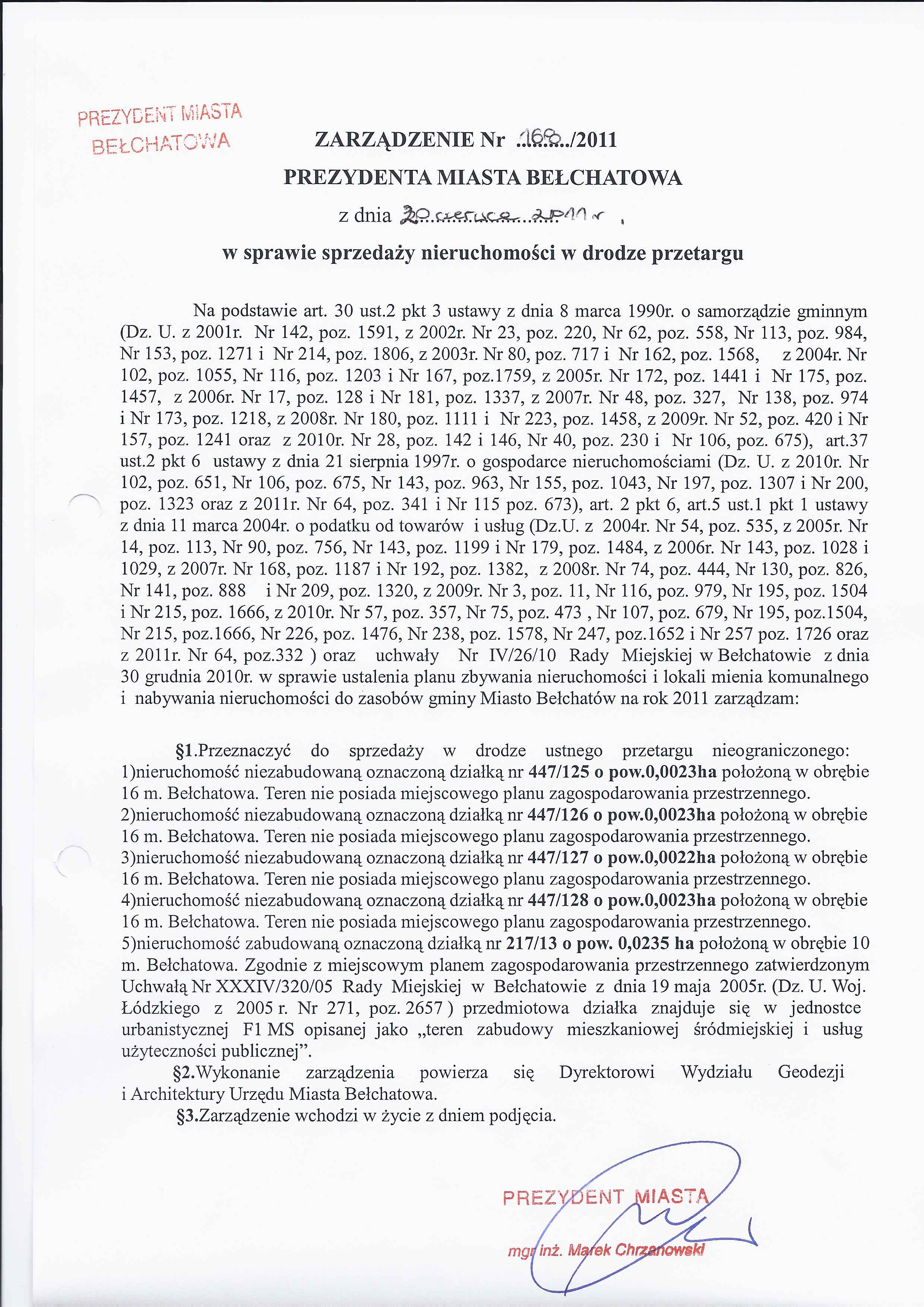 Zarządzenie Nr 168 z dnia 20 czerwca 2011 r. w/s sprzedaży nieruchomości w drodze przetargu