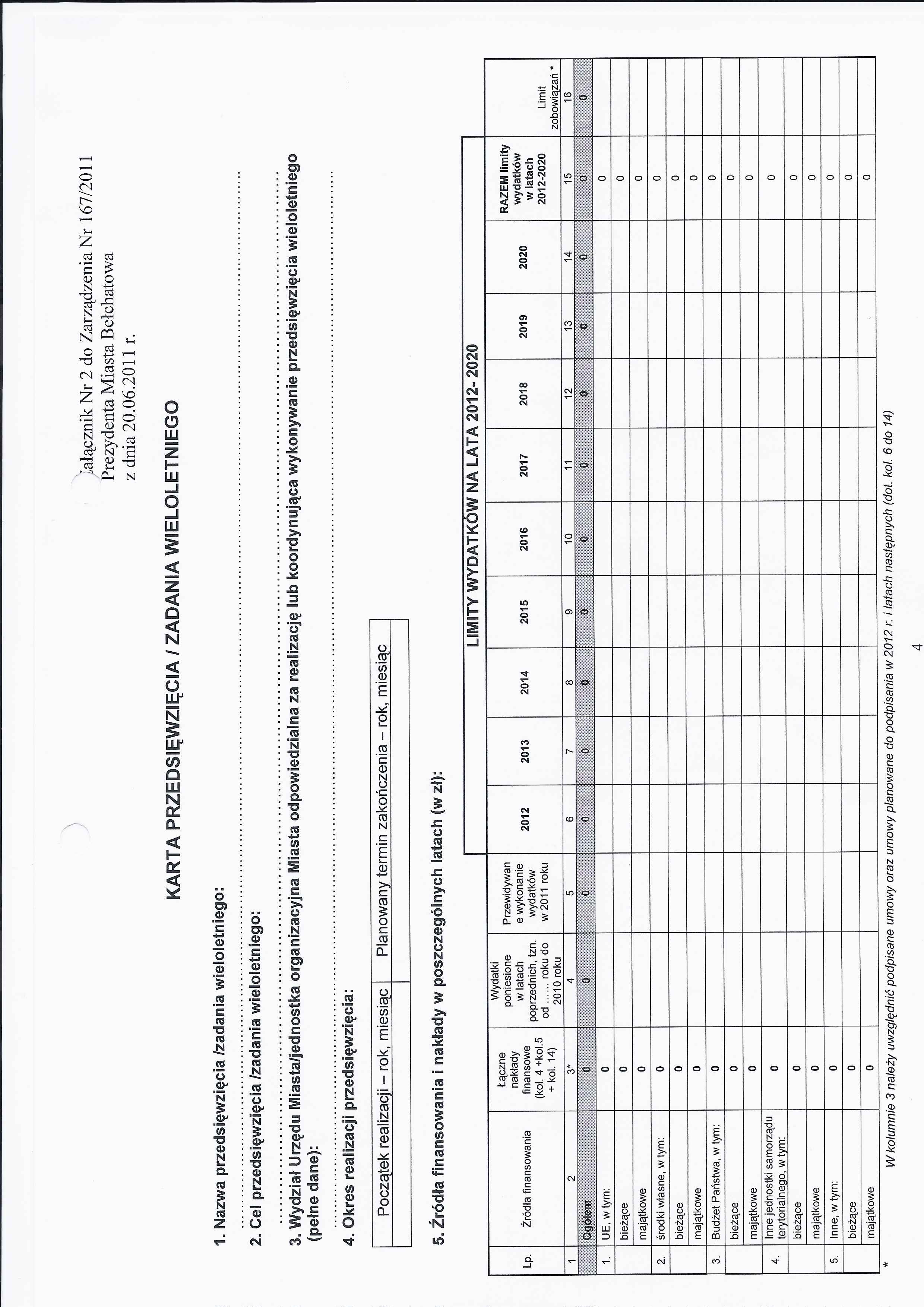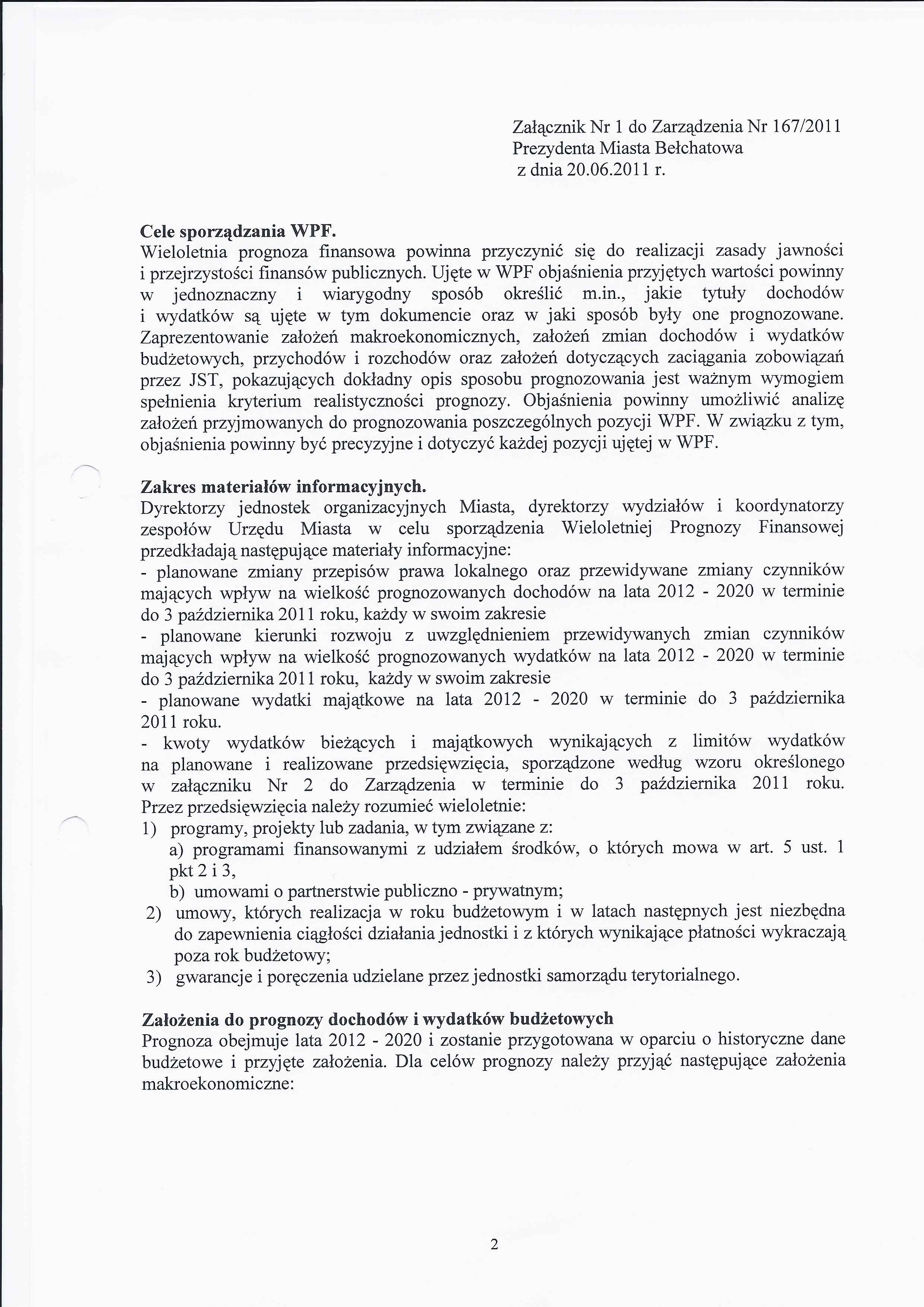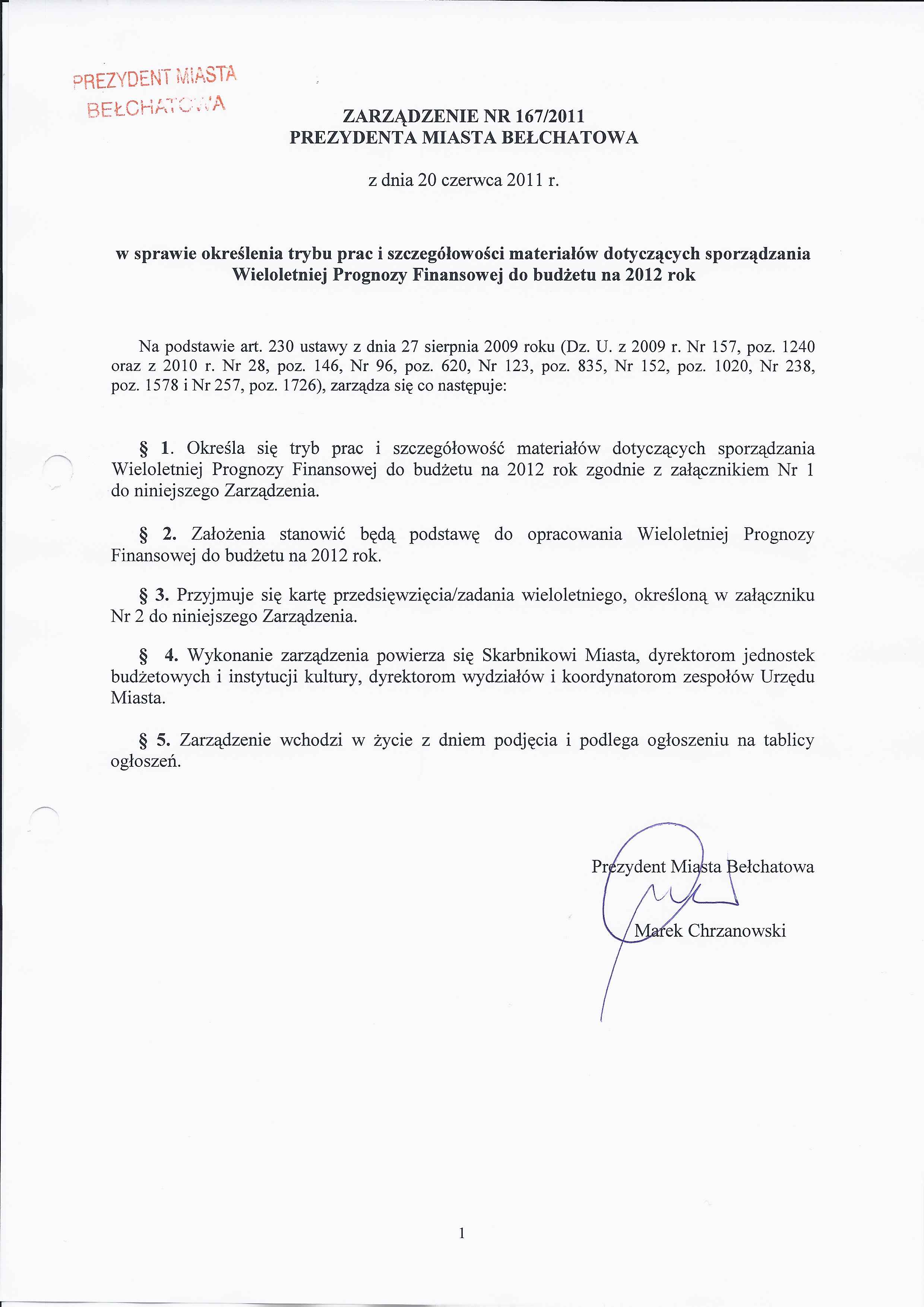 Zarządzenie Nr 167 z dnia 201 czerwca 2011 r. w/s określenia trybu prac i szczegółowości materiałów dotyczących sporządzania Wieloletniej Prognozy Finansowej do budżetu na 2012 rok