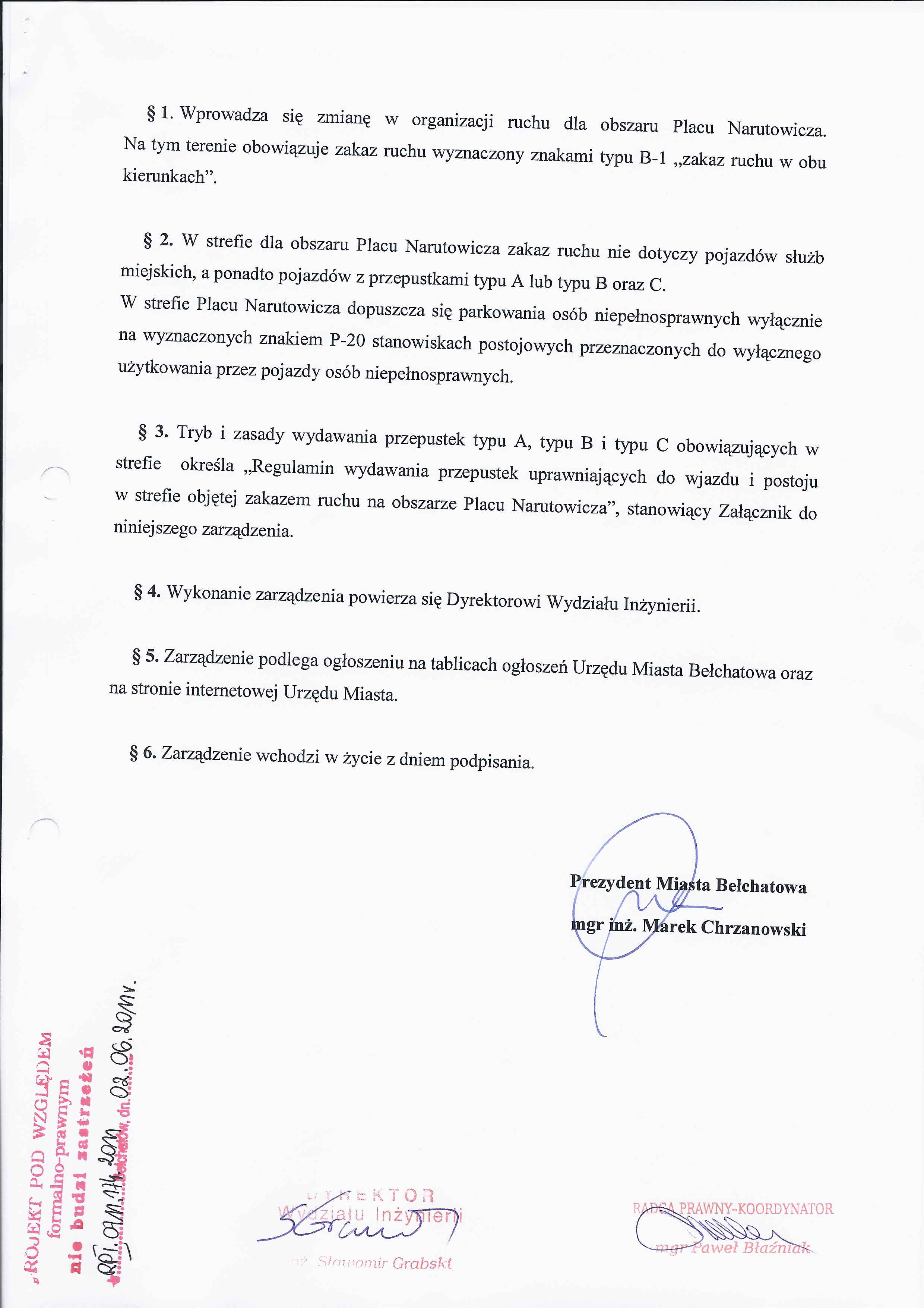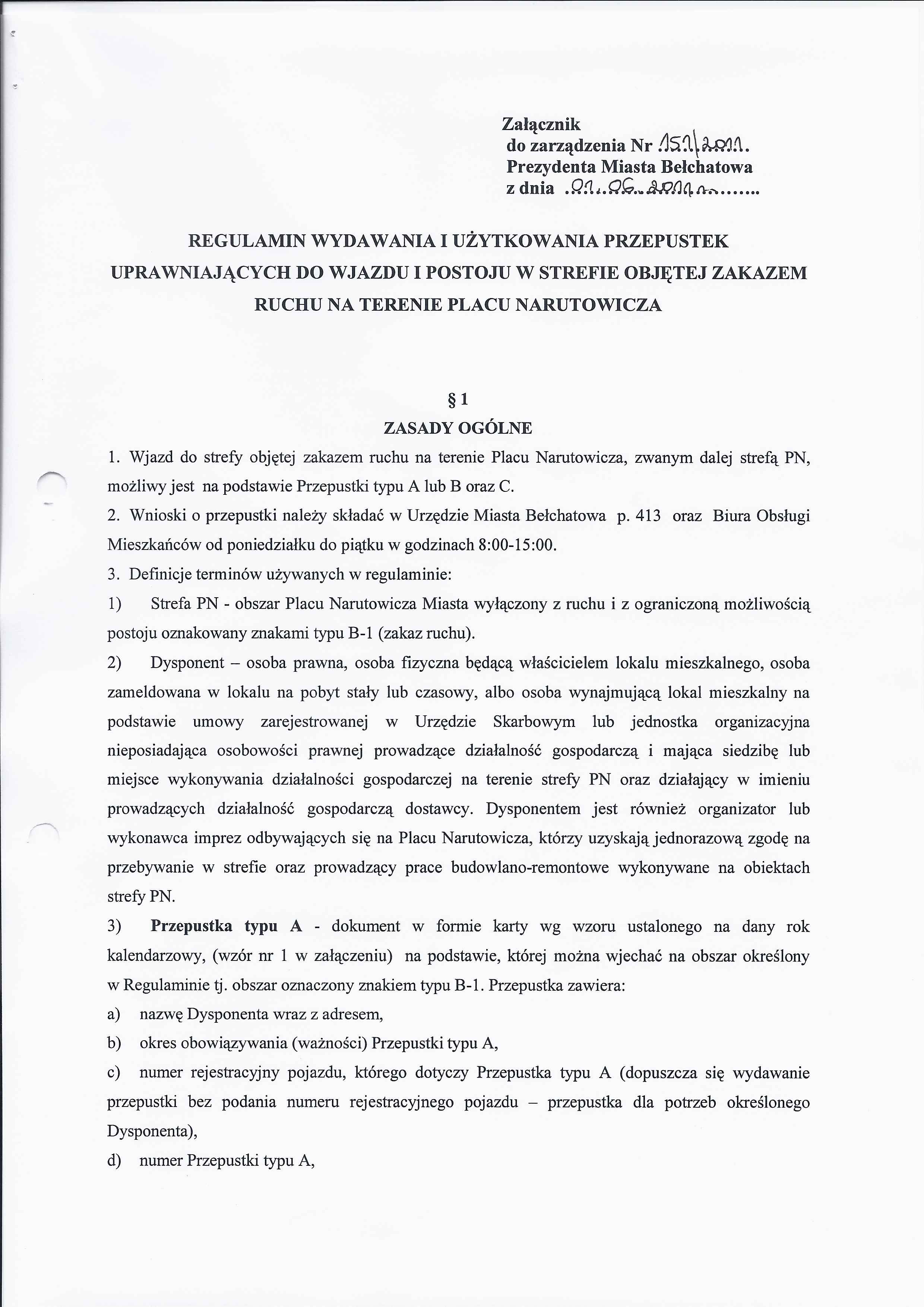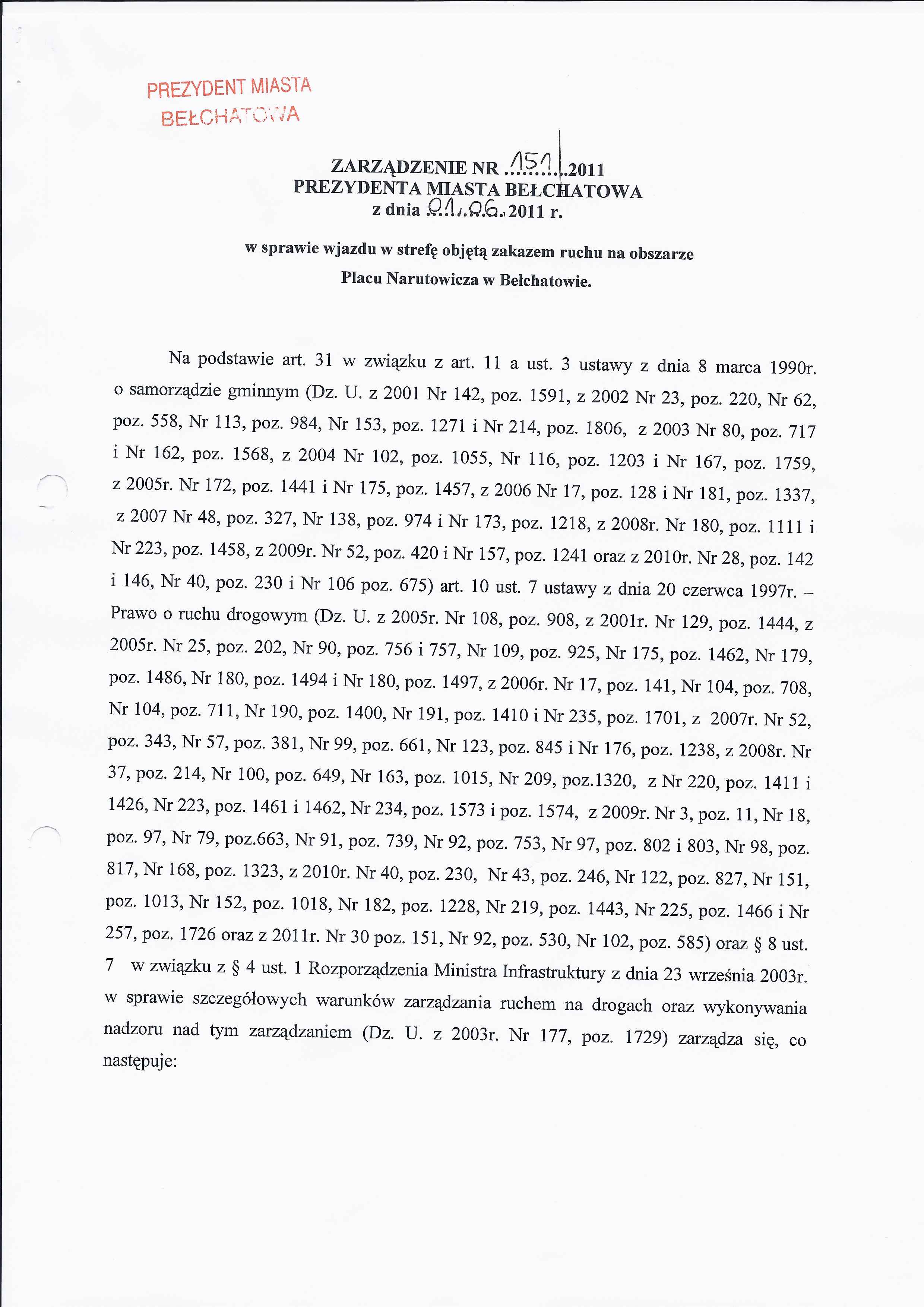 Zarządzenie Nr 151 z dnia 1 czerwca 2011 r. w/s wjazdu w strefę objętą zakazem ruchu na obszarze Placu Narutowicza w Bełchatowie
