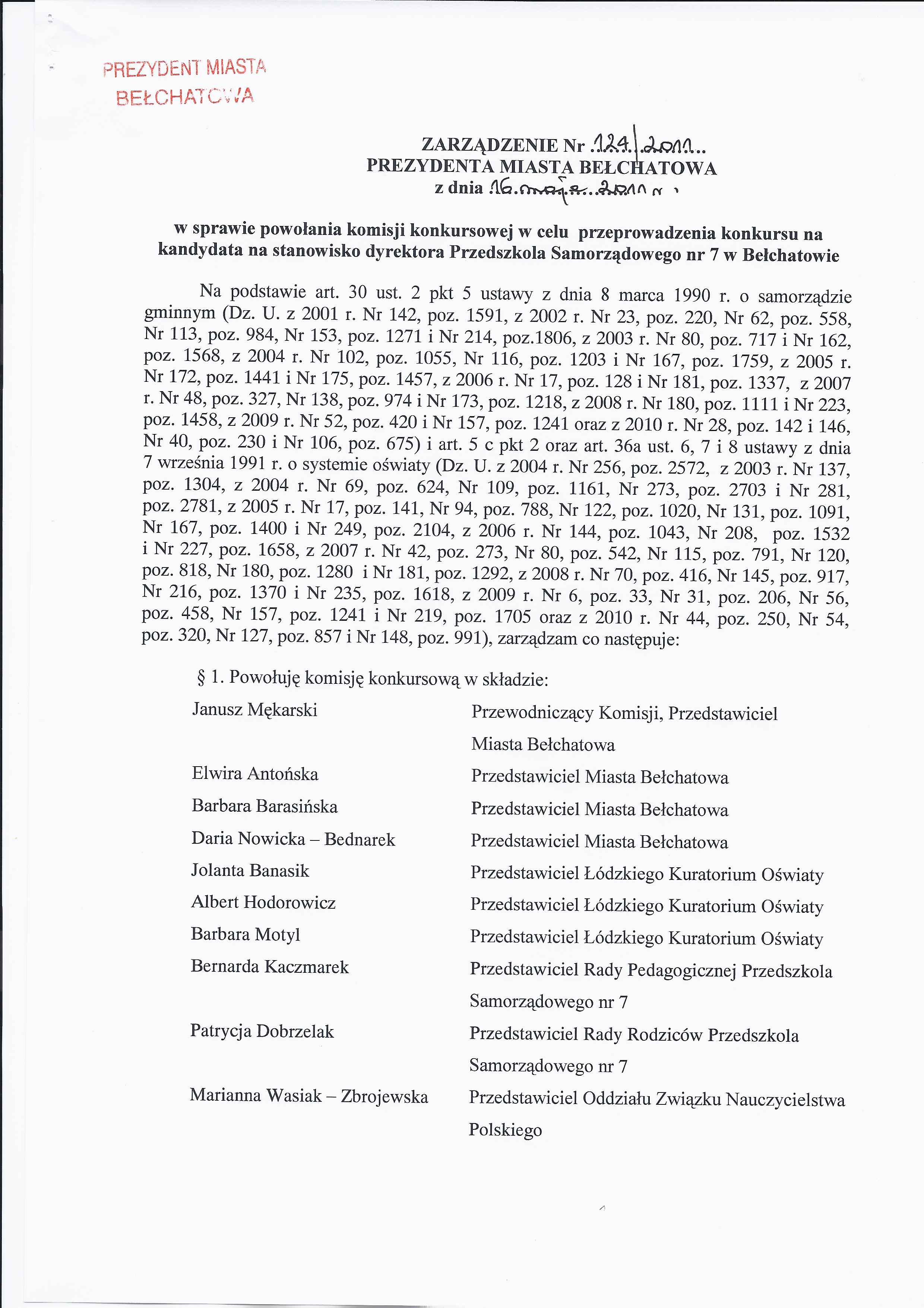 Zarządzenie Nr 124 z dnia 16 maja 2011 r. w/s powołania komisji konkursowej w celu przeprowadzenia konkursu na kandydata na stanowisko dyrektora Przedszkola Samorządowego nr 7 w Bełchatowie