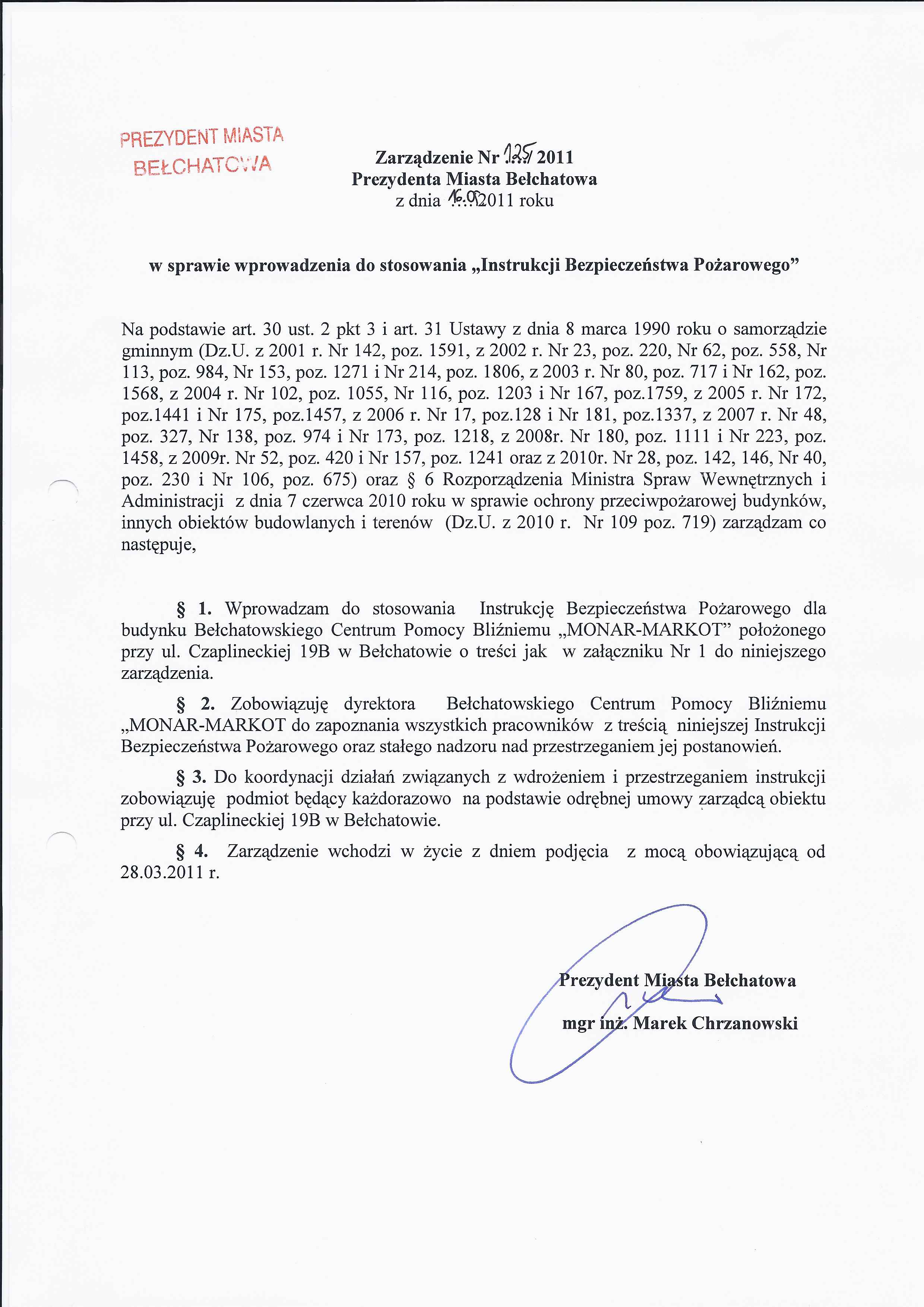 Zarządzenie Nr 125 z dnia 16 maja 2011 r. w/s wprowadzenia do stosowania "Instrukcji Bezpieczeństwa Pożarowego"