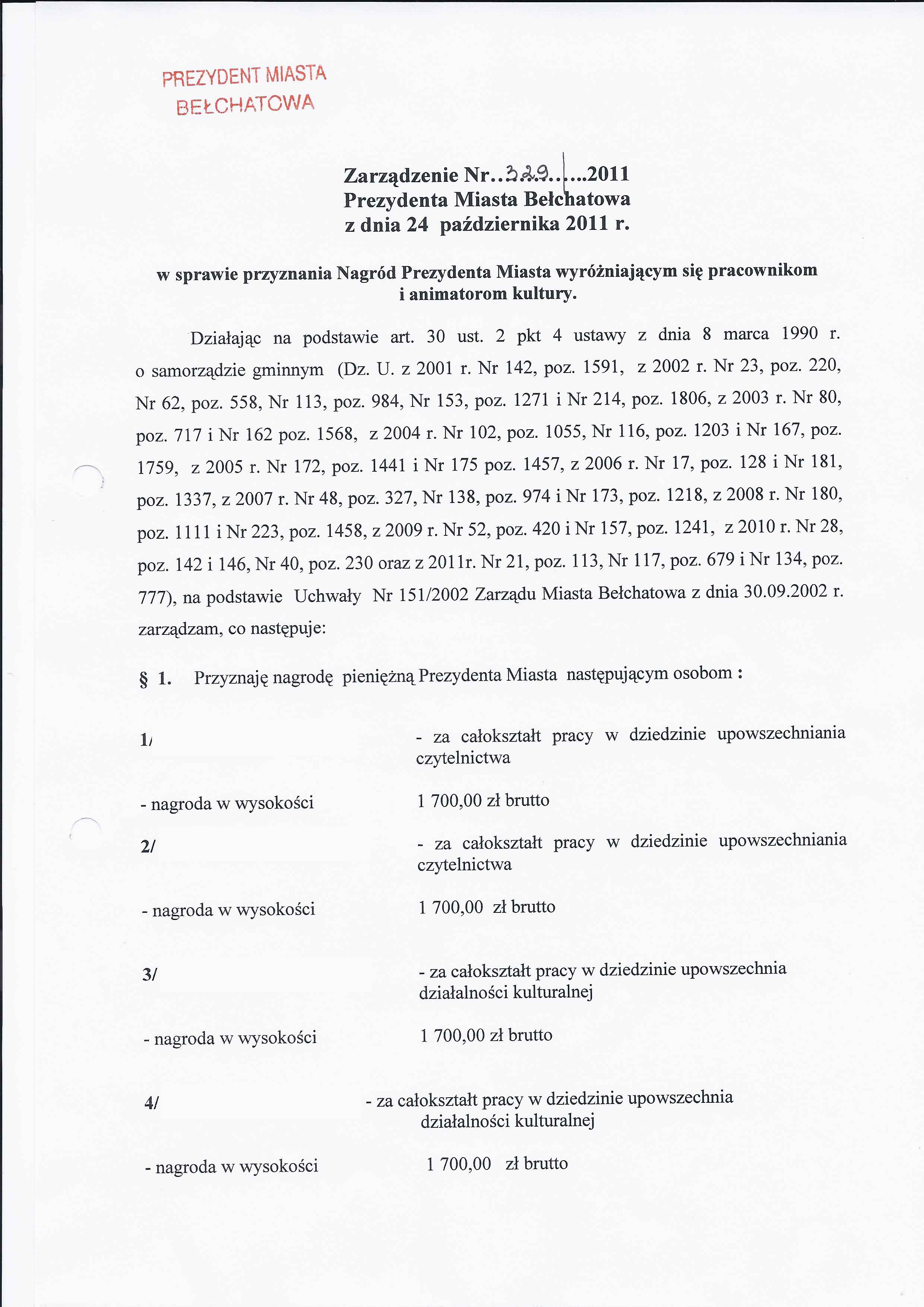 Numer zarządzenia: 329Data wydania : 24-10-2011Tytuł: Zarządzenie Nr 329 z dnia 24 października 2011 r. w/s przyznania Nagród Prezydenta Miasta wyróżniającym się pracownikom i animatorom kultury
