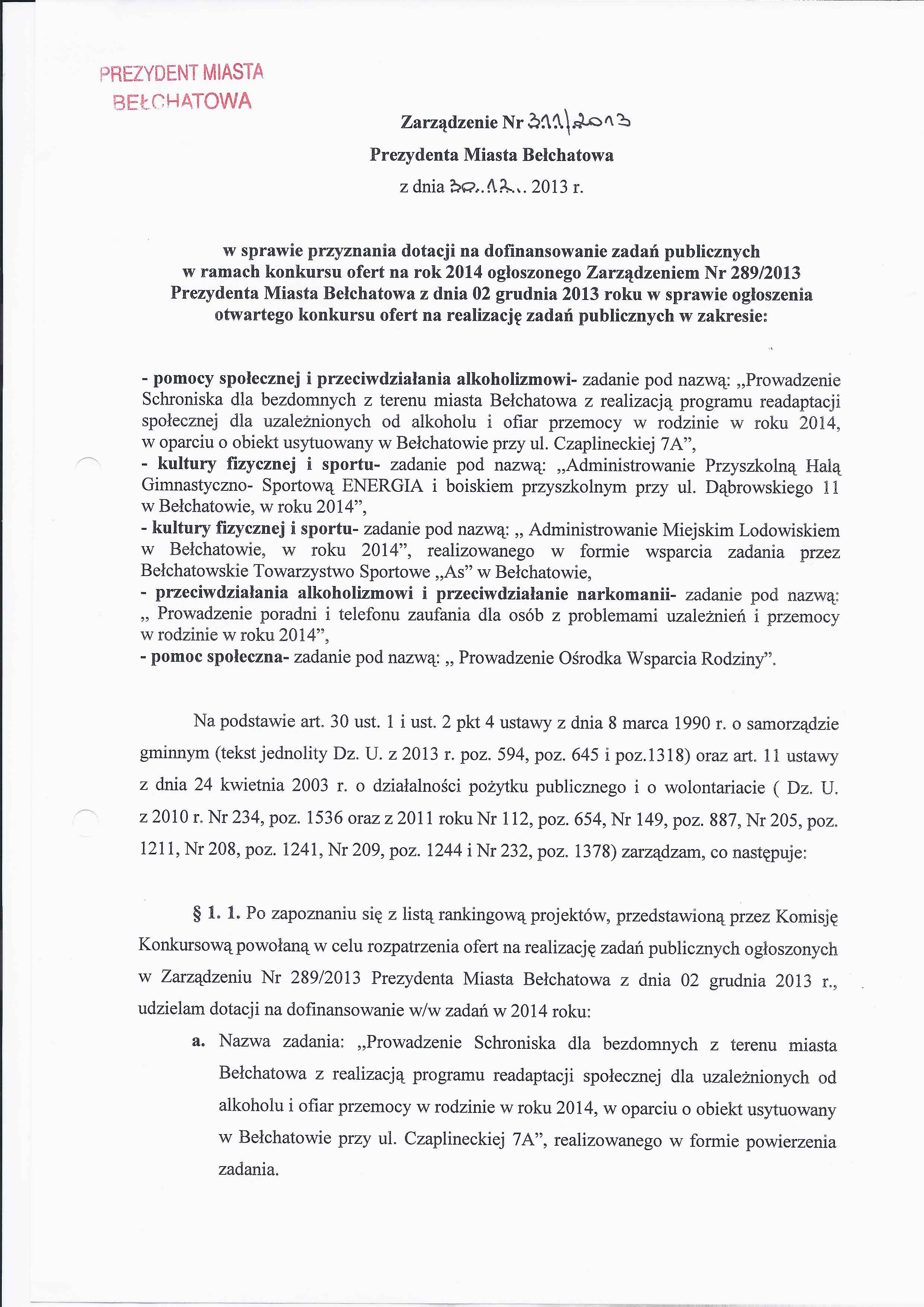 Zarządzenie Nr 311 z dnia 30 grudnia 2013 r. w/s przyznania dotacji na dofinansowanie zadań publicznych w ramach konkursu ofert na rok 2014 ogłoszonego Zarządzeniem Nr 289/2013 Prezydenta Miasta Bełchatowa z dnia 02 grudnia 2013 roku w sprawie ogłoszenia otwartego konkursu ofert na realizację zadań publicznych w zakresie: pomocy społecznej i przeciwdziałania alkoholizmowi - zadanie pod nazwą: "Prowadzenie Schroniska dla bezdomnych z terenu miasta Bełchatowa z realizacją programu readaptacji społecznej dla uzależnionych od alkoholu i ofiar przemocy w rodzinie w roku 2014, w oparciu o obiekt usytuowany w Bełchatowie przy ul. Czaplinieckiej 7A"; kultury fizycznej i sportu - zadanie pod nazwą: "Administrowanie Przyszkolną Halą Gimnastyczno-Sportową "ENERGIA" i boiskiem przyszkolnym przy ul. Dąbrowskiego 11 w Bełchatowie, w roku 2014"; kultury fizycznej i sportu - zadanie pod nazwą: "Administrowanie Miejskim Lodowiskiem w Bełchatowie, w roku 2014", realizowanego w formie wsparcia zadania przez Bełchatowskie Towarzystwo Sportowe "As" w Bełchatowie; przeciwdziałanie alkoholizmowi i przeciwdziałanie narkomanii - zadanie pod nazwą: "Prowadzenie poradni i telefonu zaufania dla osób z problemami uzależnień i przemocy w rodzinie w roku 2014"; pomoc społeczna - zadanie pod nazwą: "Prowadzenie Ośrodka Wsparcia Rodziny"