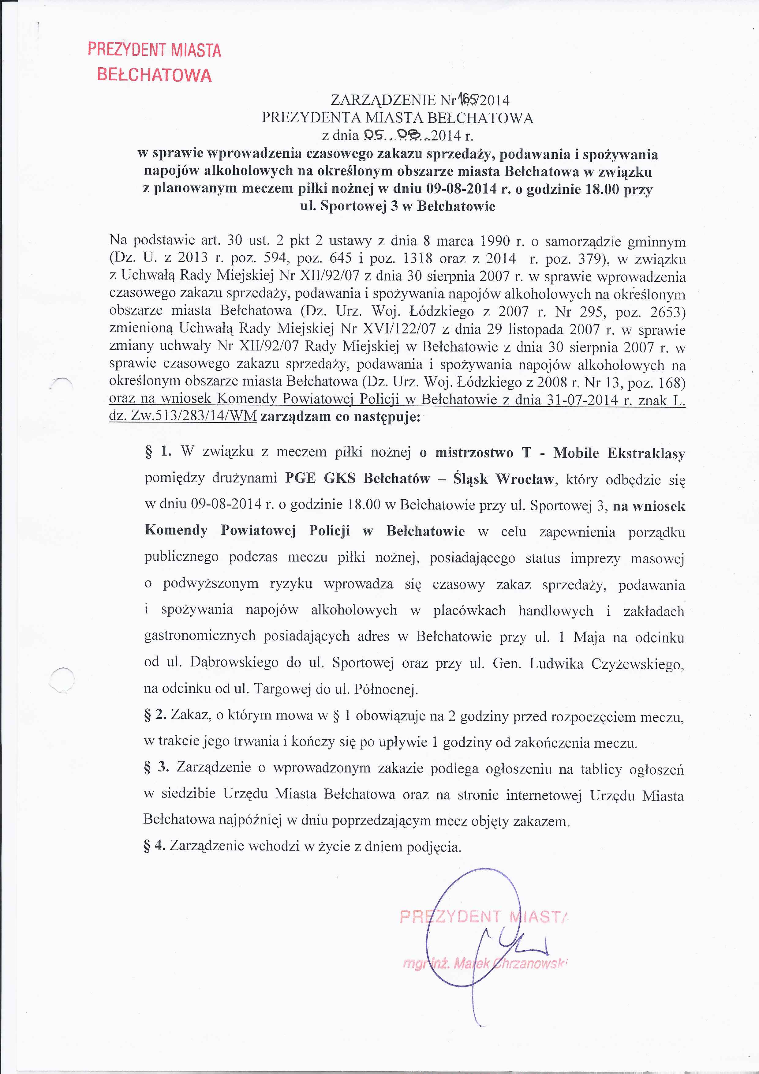 Zarządzenie Nr 165 z dnia 5 sierpnia 2014 r. w/s wprowadzenia czasowego zakazu sprzedaży, podawania i spożywania napojów alkoholowych na określonym obszarze miasta Bełchatowa w związku z planowanym meczem piłki nożnej w dniu 09-08-2014 r. o godzinie 18.00 przy ul. Sportowej 3 w Bełchatowie